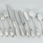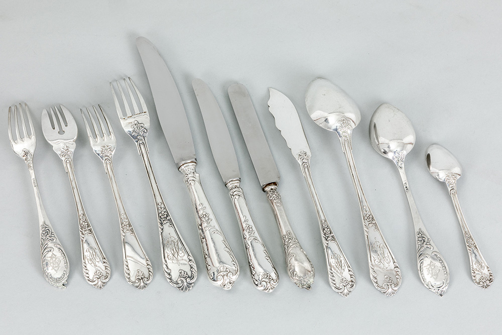 Lot met 132 stuks bestek (deels in etuis) in massief zilver – totaal gewicht (zonder messen) : ca 5000 gram
