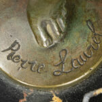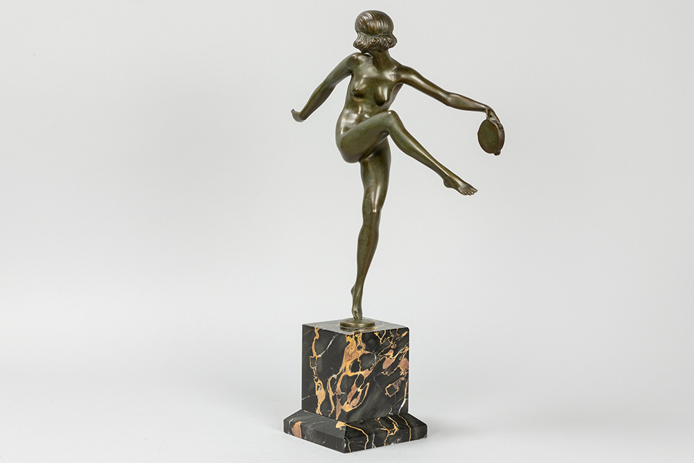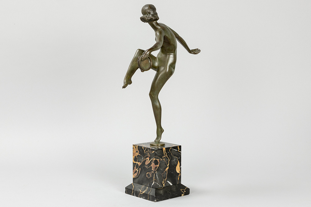 PIERRE LAUREL alias LEFAGUAYS PIERRE (1892 – 1962) Art Deco-sculptuur in brons op een typische marmeren sokkel : “Danseuse au tambourin” – hoogte : 48,5 cm – ca 1925/30 getekend