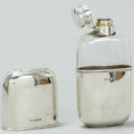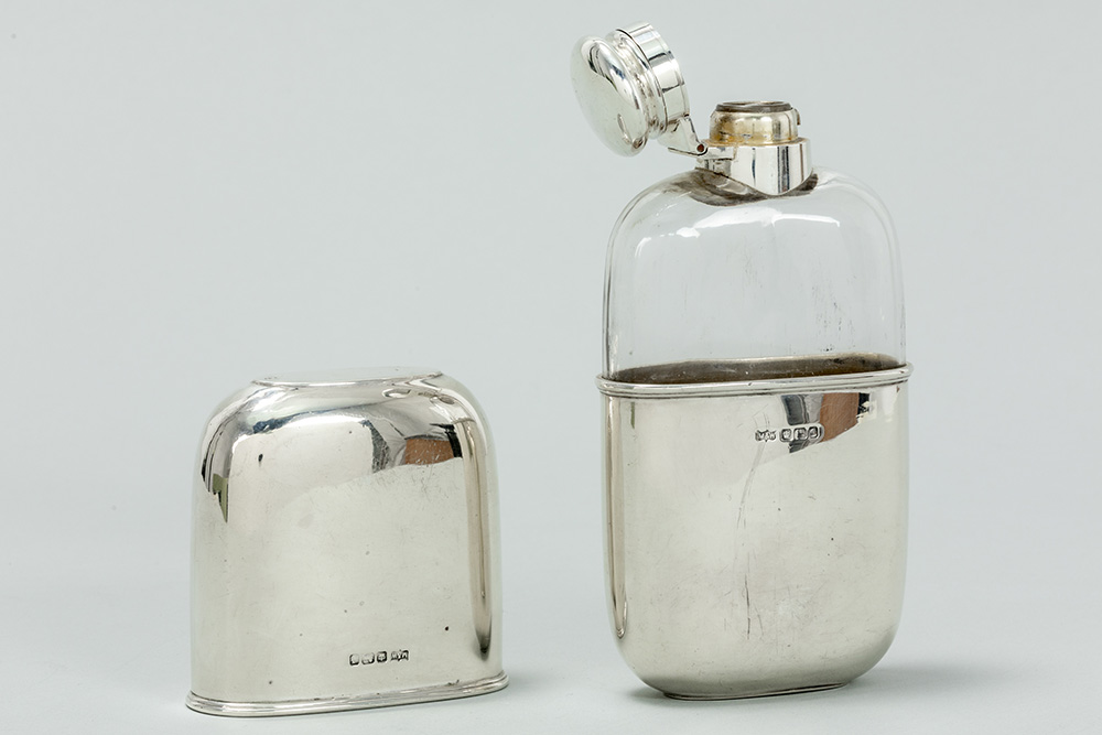 pocket flask in glass and Mappin & Webb signed and Sheffield 1908(?) marked silver