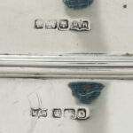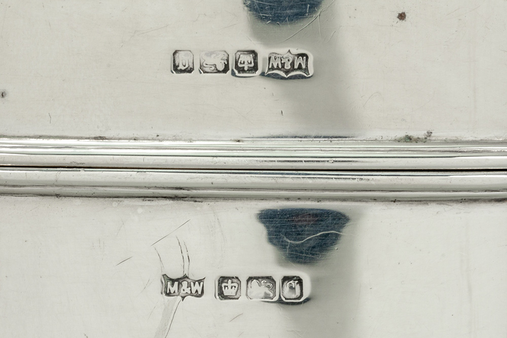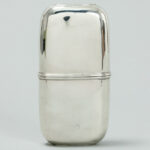 MAPPIN & WEBB zakfles in glas met dop en etui (met beker) in massief zilver, gemerkt “925 – Sheffield 1908 (?)” – hoogte : 15 cm getekend