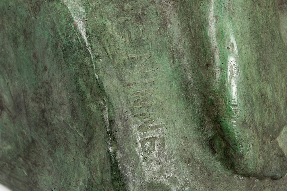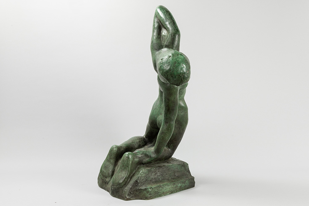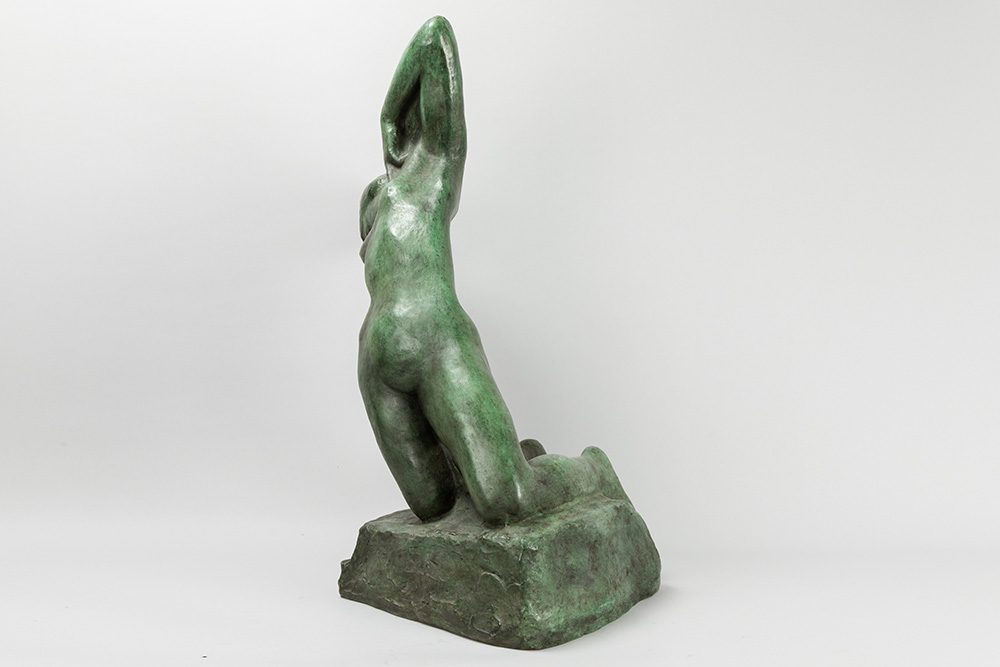 MINNE GEORGE (1866 – 1941) sculptuur in brons met groene patine : “Baadster III” (“Baigneuse III”) – hoogte : 80 cm – postume gieting in oorsprong van 1913 getekend Lit : Leo Van Puyvelde dd 1930 pl 60 (cat. n° 65)