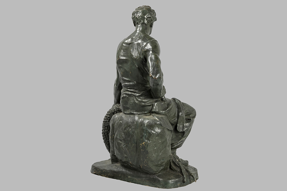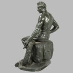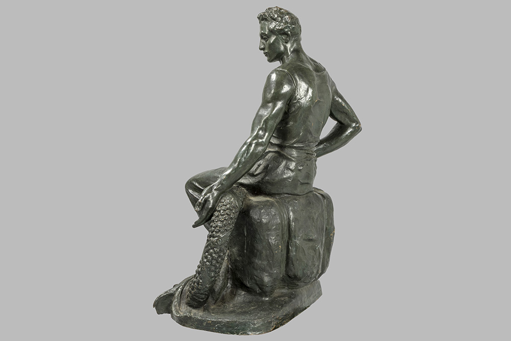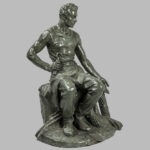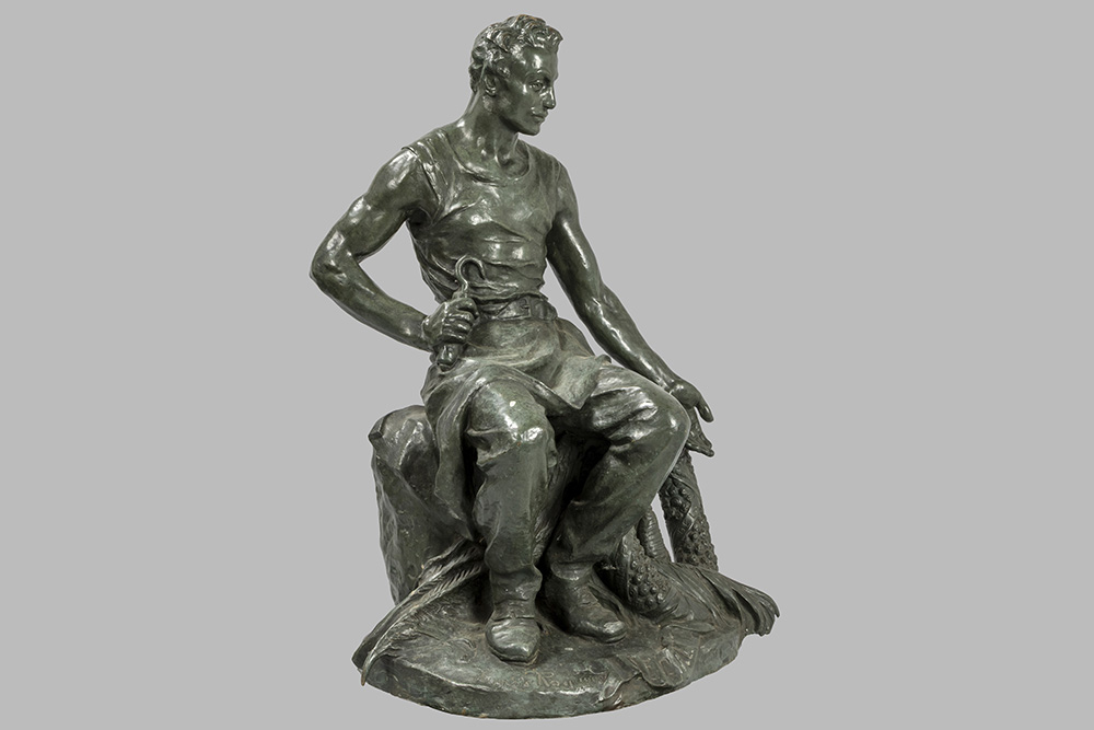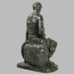 LE ROY HIPPOLYTE (1857 – 1943) vrij grote sculptuur in brons met groene patine en met de voorstelling van een zittende man met sikkel, getiteld “Regrets” – ca 94 x 68 x 40 cm – ca 1920/30 getekend