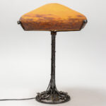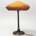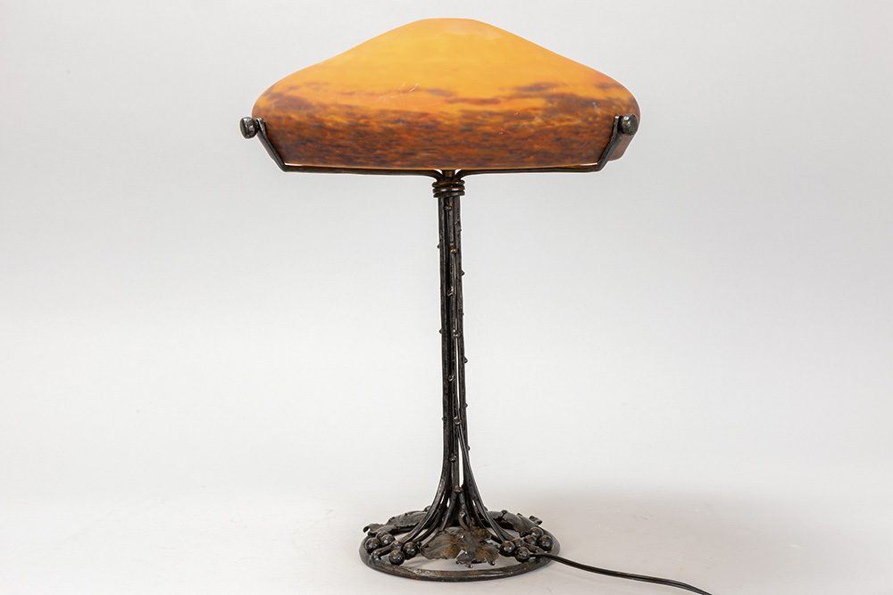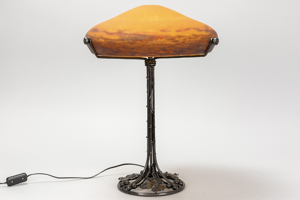 quite big Müller frêres Lunéville signed Art Deco mushroom-lamp with beautiful base in wrought iron and a shade in pâte de verre