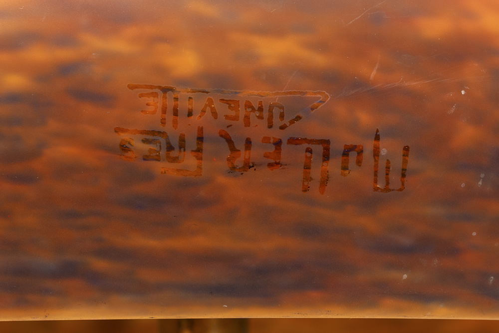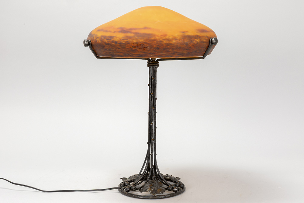 MÜLLER frêres LUNEVILLE mooie grote champignonvormige Art Deco lamp met fraaie ranke voet in smeedijzer en vrij grote kap in gemarmerde glaspasta – hoogte : 52 cm – ca 1925 getekend