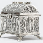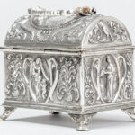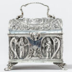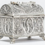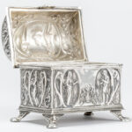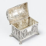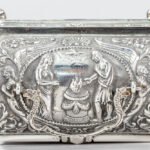 Antiek Fries zgn “knottekistje” in massief zilver met typische ornamentiek – breedte : 8 cm – gewicht : 182 gram Het kistje is een verlovingsgeschenk en bevatte munten, als de vrouw het aannam, was de verloving een feit. De kistjes zijn vaak versierd met liefdesthema’s en kwamen voort uit het oudere gebruik van een ‘knottedoek’, een zijden doek met een knoop waar munten in werden gelegd.