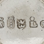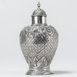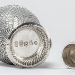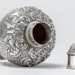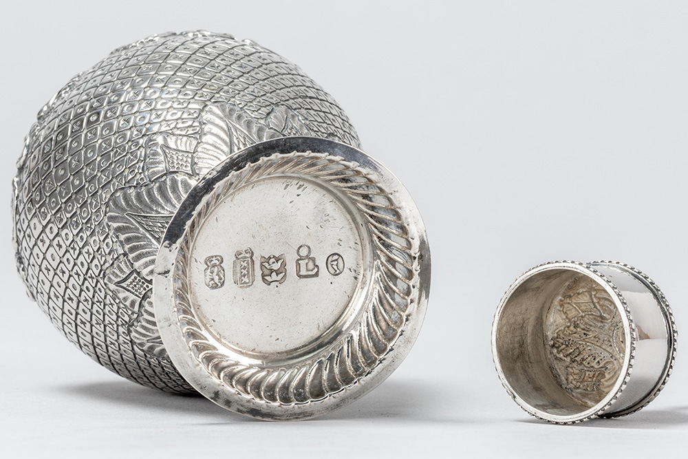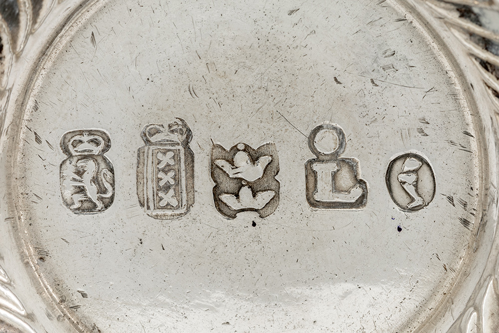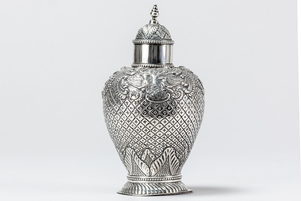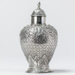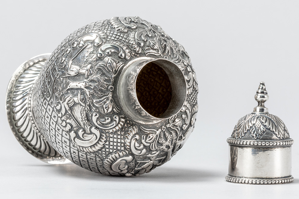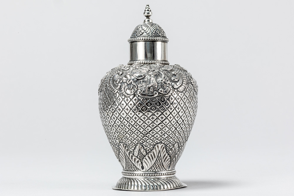 Antieke zgn “Haarlemse” theebus in massief zilver met allerlei merken – hoogte : 14 cm – gewicht : 116 gram
