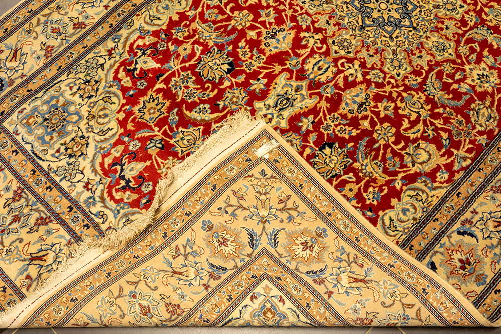 Zeer fijn geknoopte Perzische Nain in wol en zijde met vrij klassieke medaillontekening op een rode fond – 267 x 156 cm