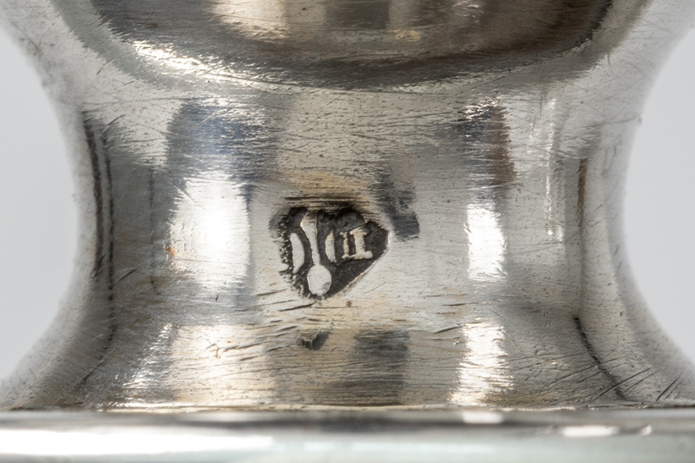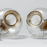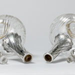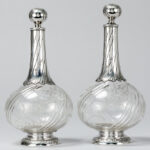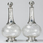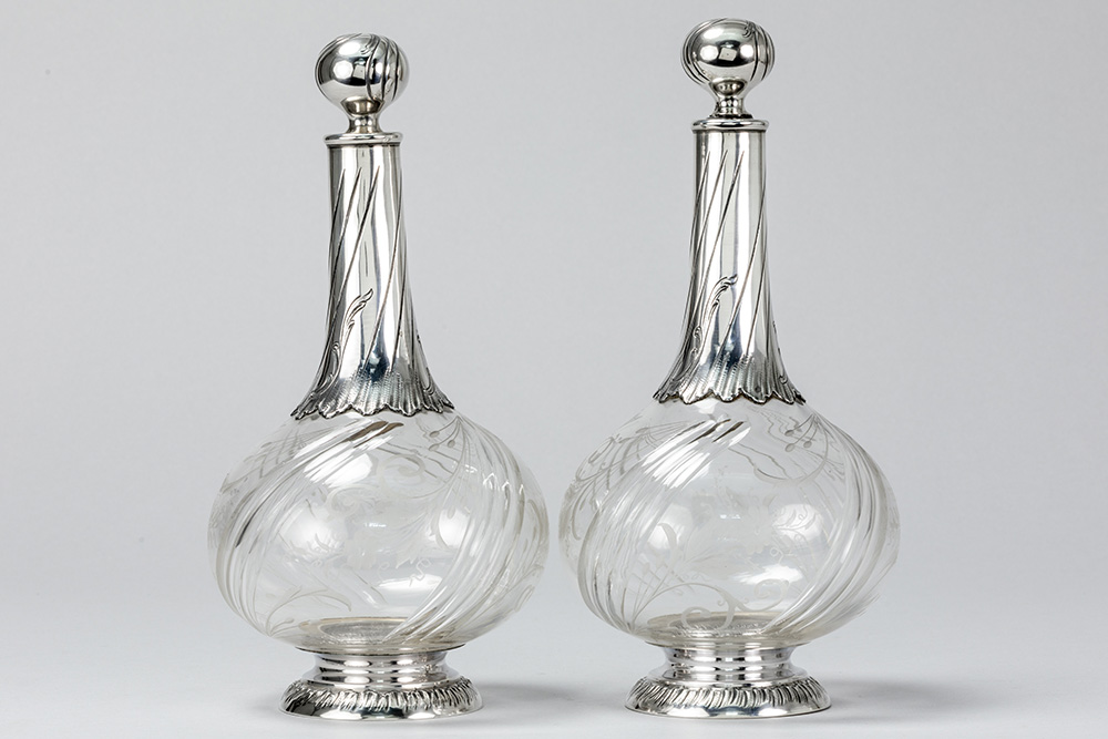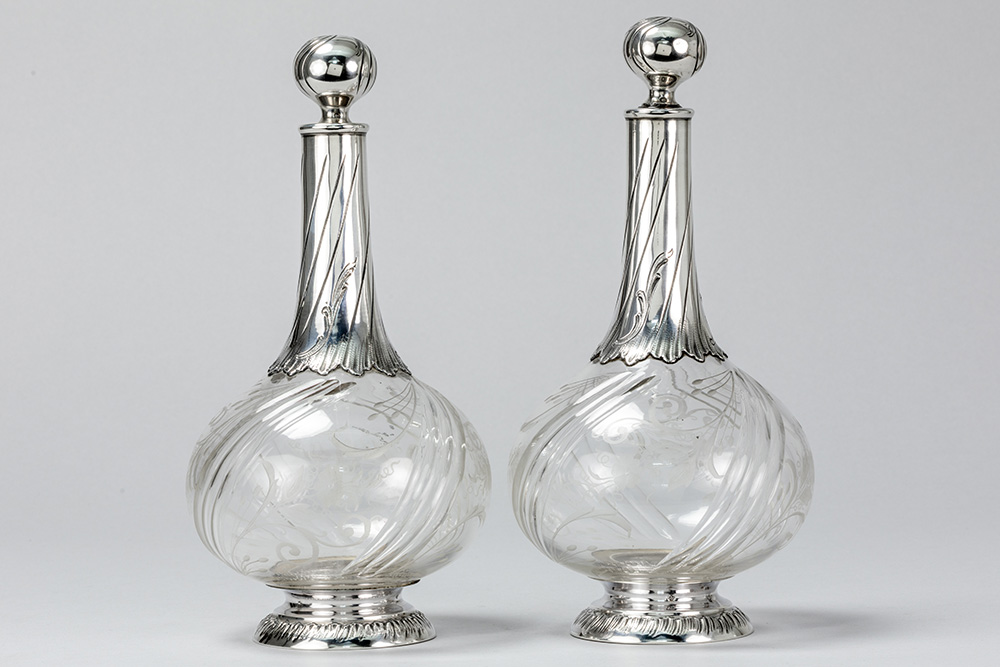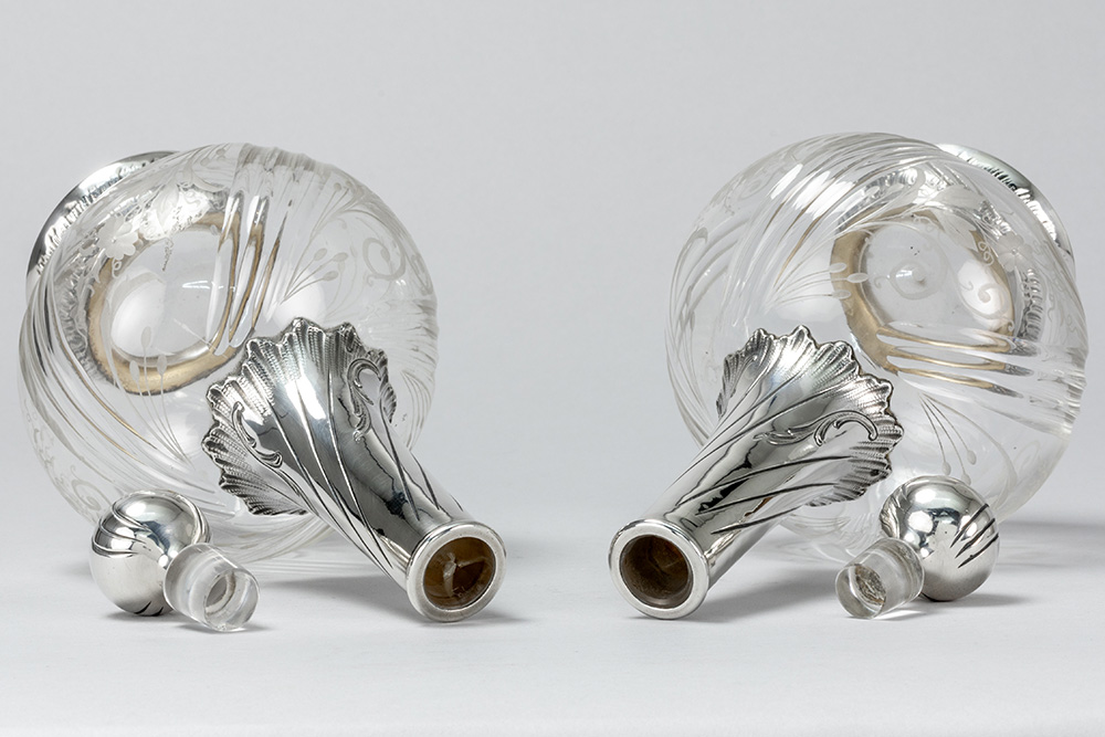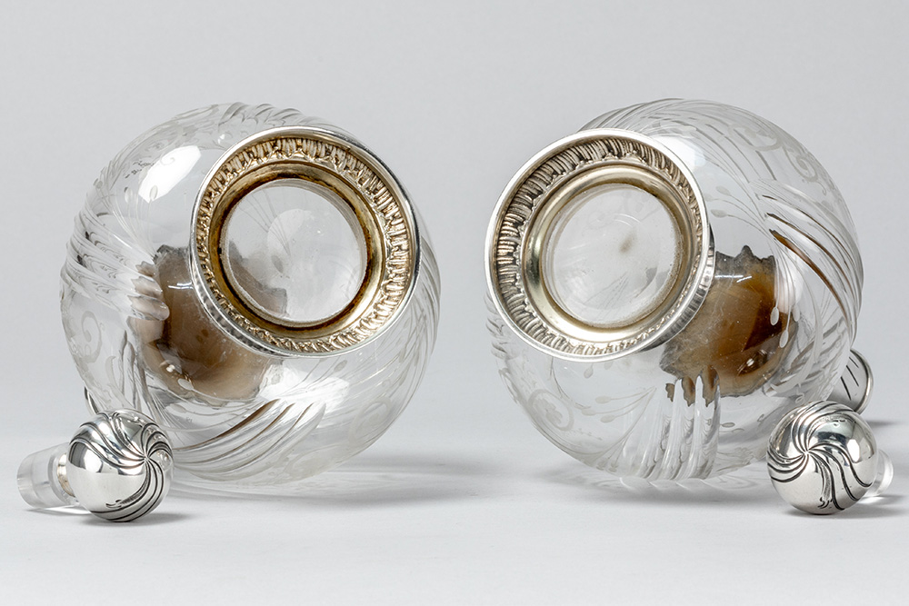 HENRI LAPEYRE paar antieke karaffen in kleurloos kristal met een geëtst decor en met een montuur in massief zilver, gemerkt met tête de Minerve – hoogte : 26 cm getekend