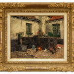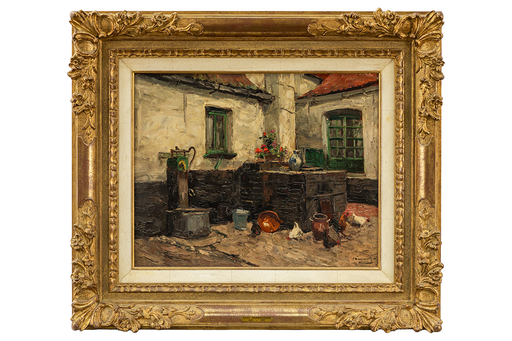 WAGEMAEKERS VICTOR (1876 – 1953) olieverfschilderij op paneel : “Zicht van een binnenkoer met kippen” – 40 x 50 getekend