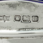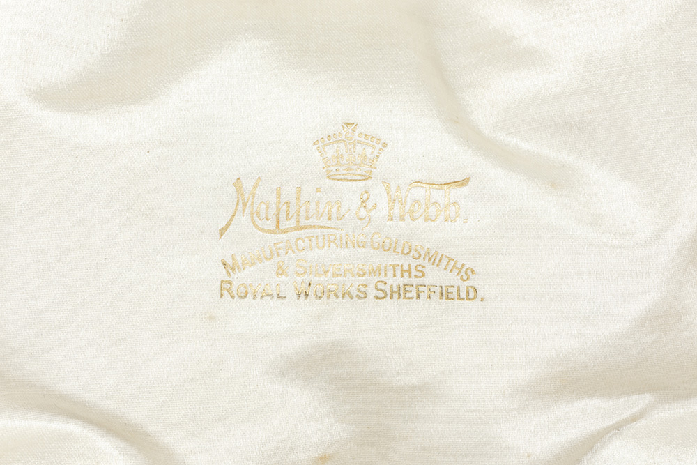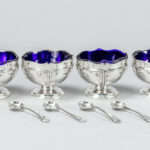 Mappin & Webb signed Art Nouveau set with four salts in “925 – Sheffield 1904” marked silver with their blue glass liners – with its original case