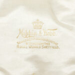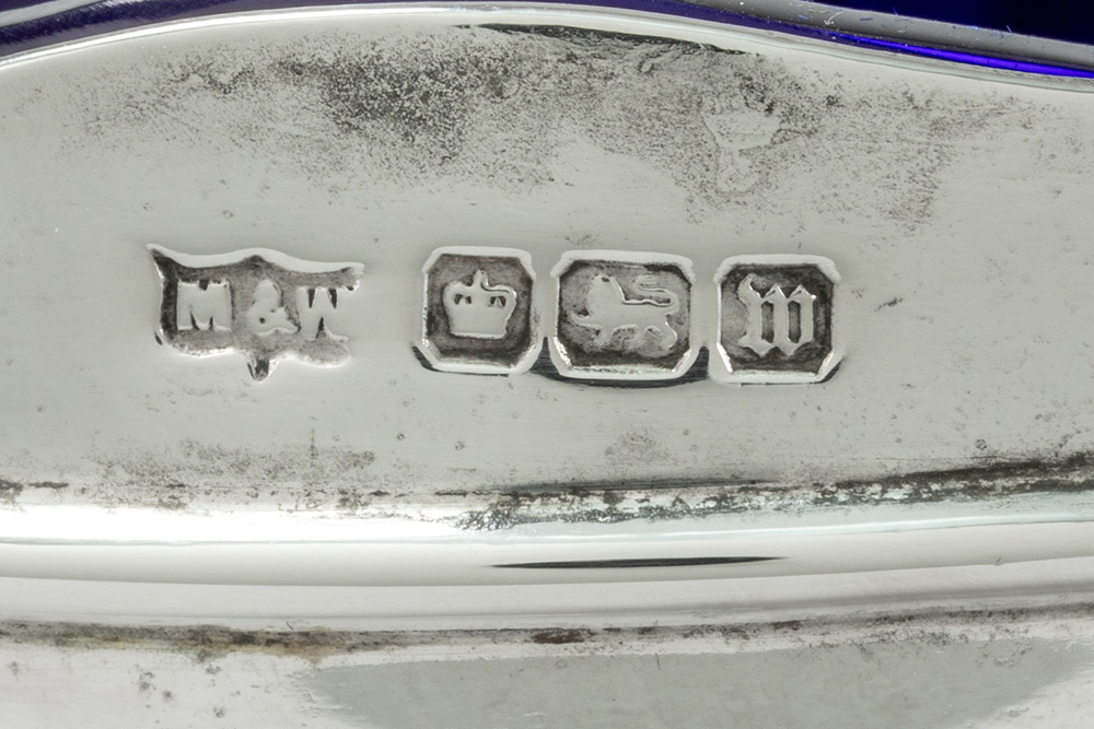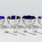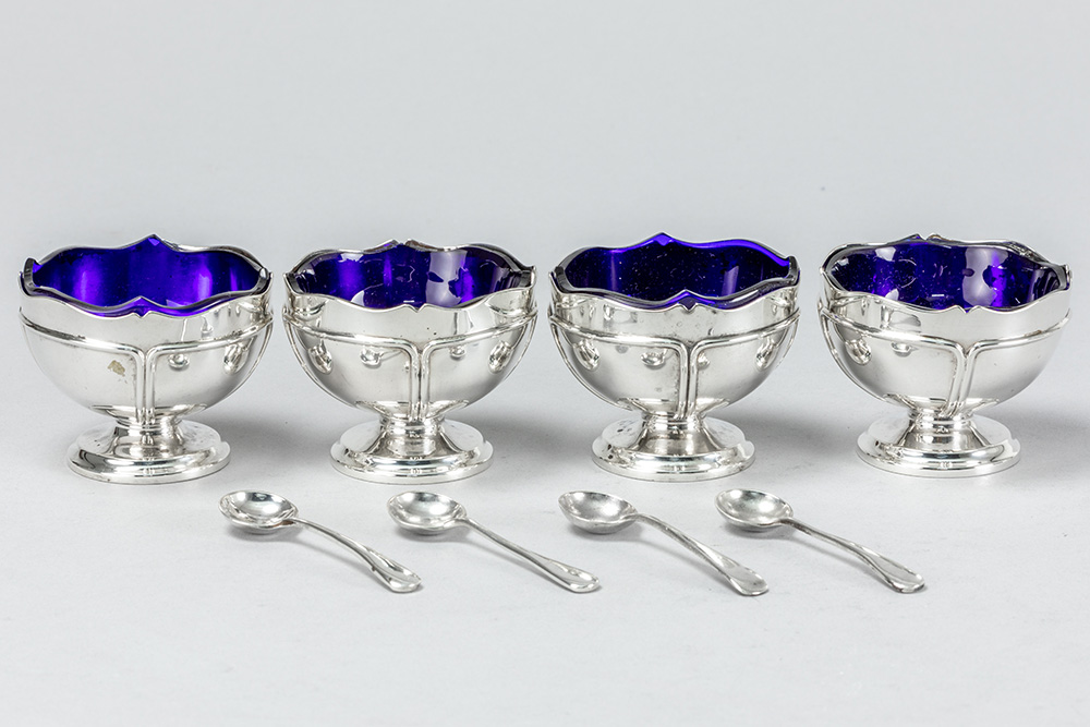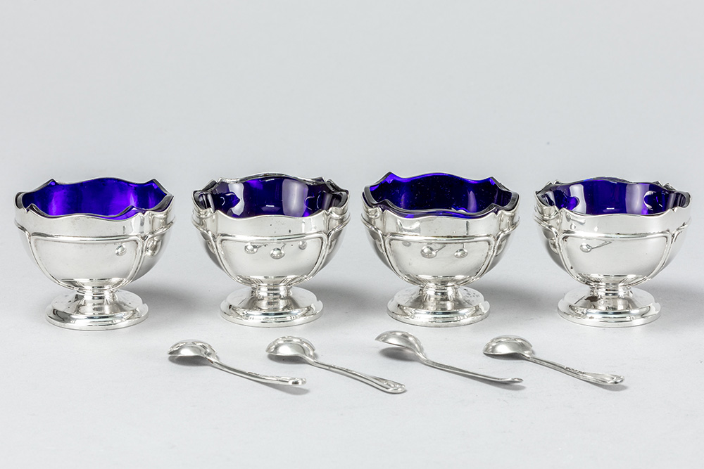 MAPPIN & WEBB vierdelige Art Nouveau-set met vier zoutvaatjes in massief zilver, gemerkt “925 – Sheffield 1904”, met sobere ornamentiek en telkens met liner in blauw kristalglas – gewicht aan zilver: 304 gram – in originele etui met vier lepeltjes getekend