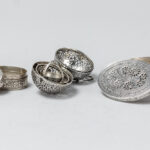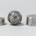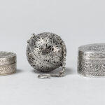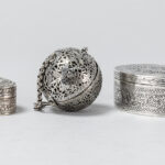 Lot (3) met twee ovale gedekselde doosjes, waaronder een zgn “vinaigrette” met typisch geperceerd deksel in massief zilver gemerkt “800”, & een zgn geurbal in verzilverd metaal