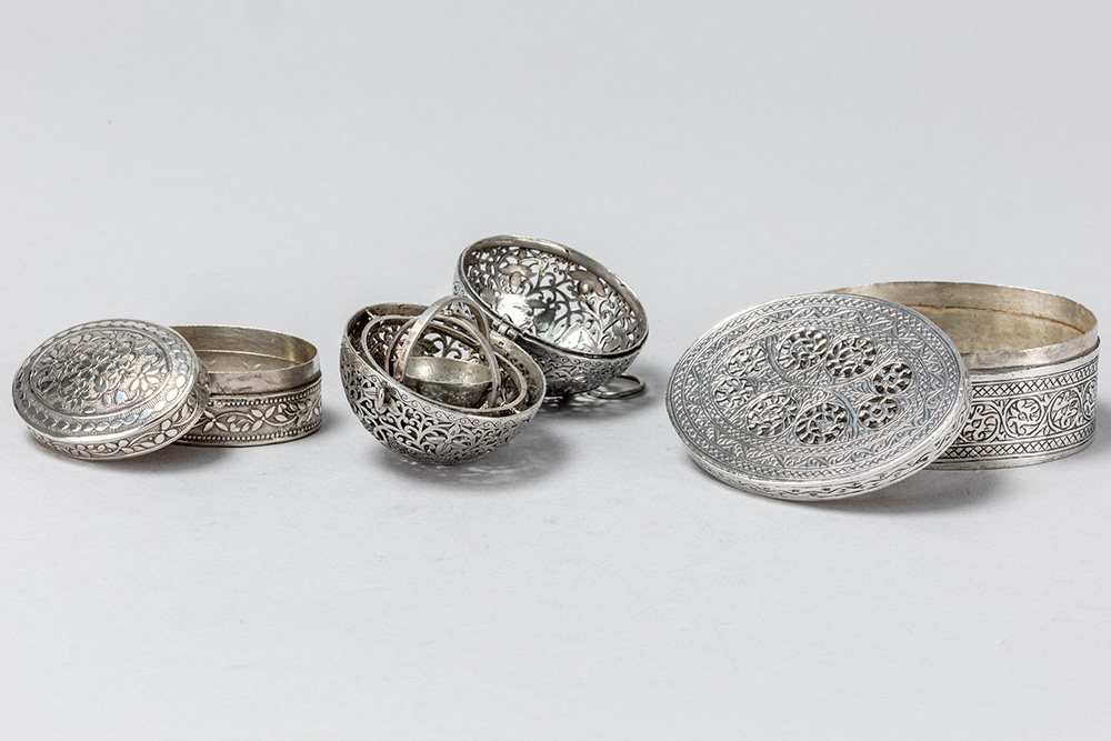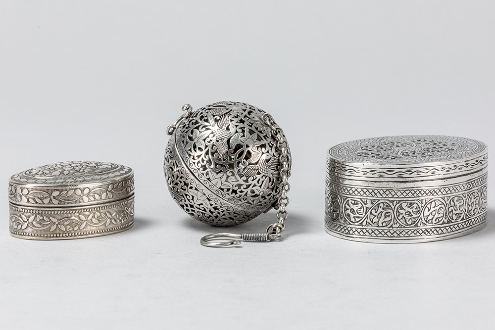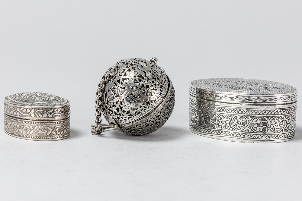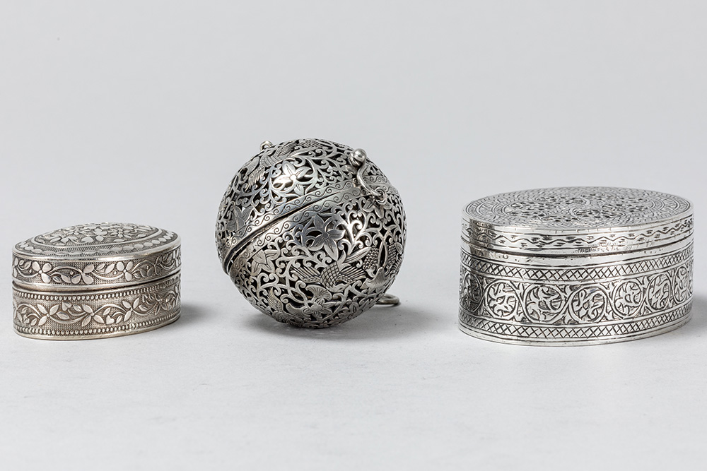 Lot (3) containing two oval lidded boxes, including a so-called vinaigrette with a typically pierced lid in solid silver marked “800”, and a scent ball in silver-plated metal