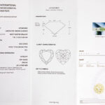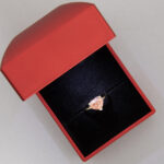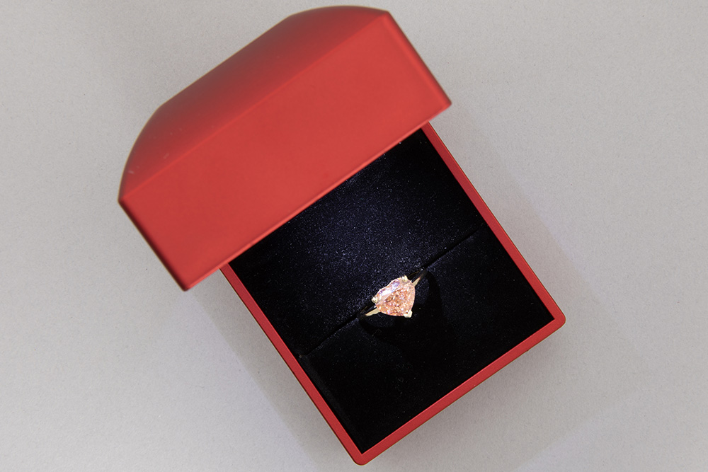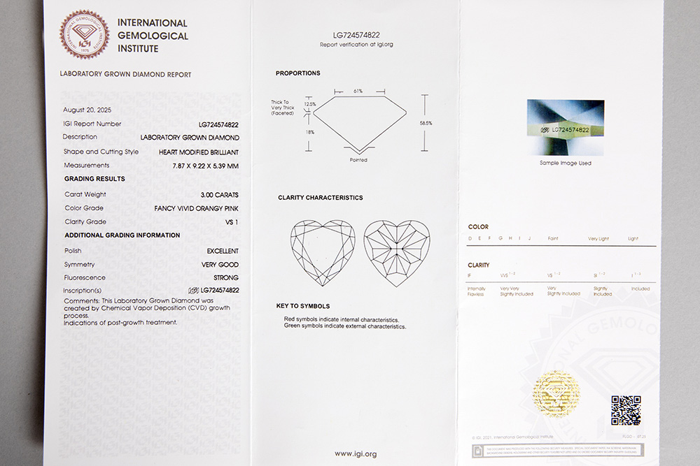 high quality heart-shaped brilliant cut fancy “pink orangy” CVD diamond set in a ring in yellow gold (14 carat) with IGI certificate