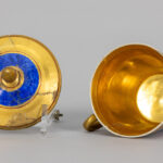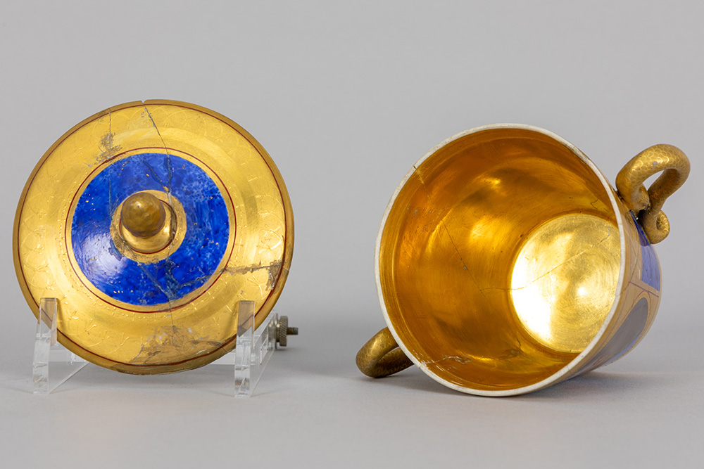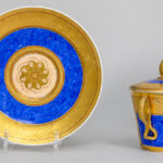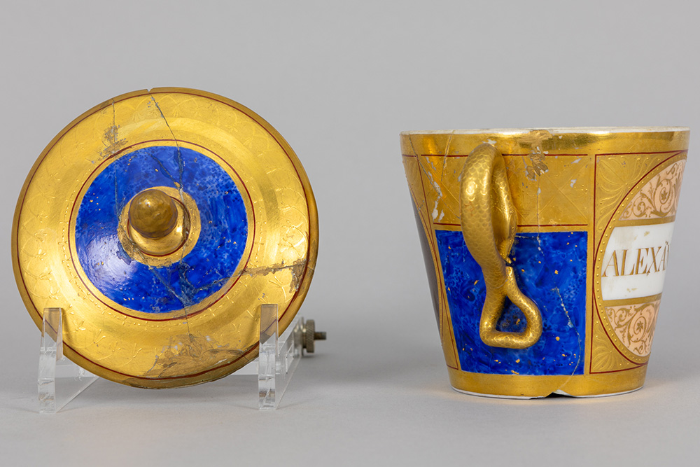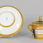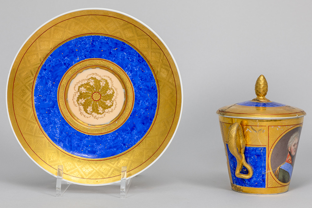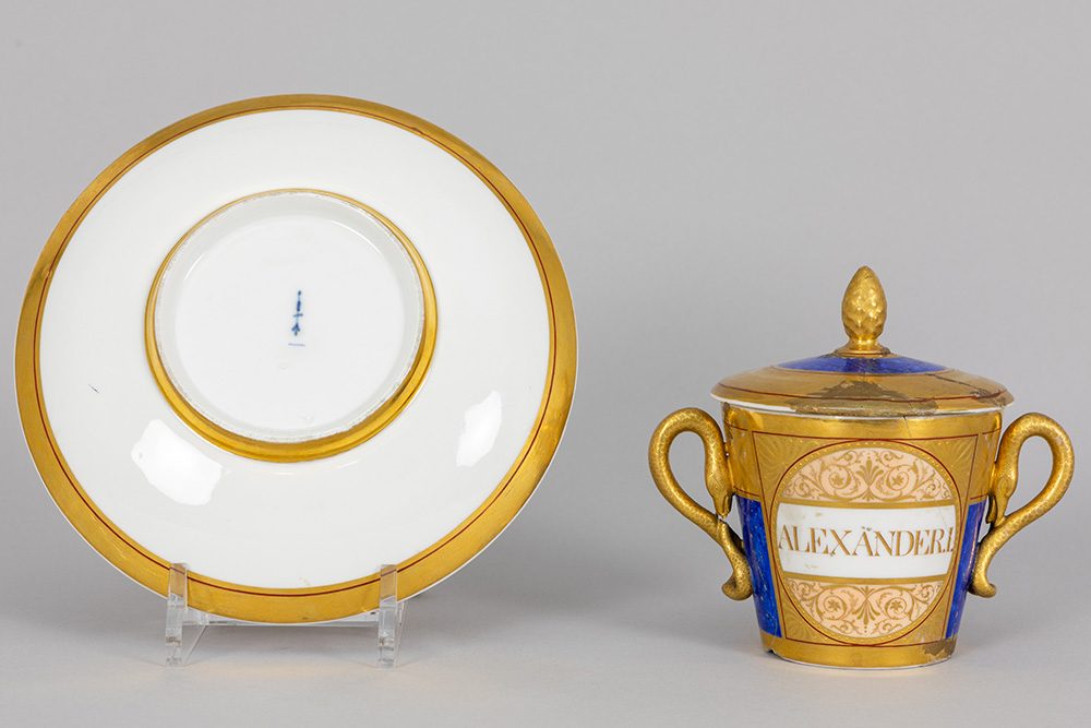 antique covered bowl with handles in the shape of snakes and matching underplate from the 1st half of the 19th Cent. in porcelain, marked Berlin, with the name of Tsar Alexander I on one side and a medallion with his portrait on the other