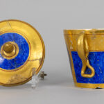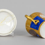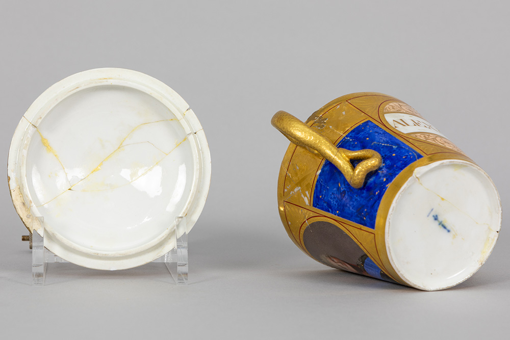 Antieke gedekselde kom met grepen in de vorm van slangen en bijhorend onderbord uit 1° helft van de 19° eeuw in porselein, gemerkt Berlijn, met aan de ene zijde de naam van Tsaar Alexander I en aan de andere een medaillon met zijn portret  –  hoogte : 13,5 cm met restauraties