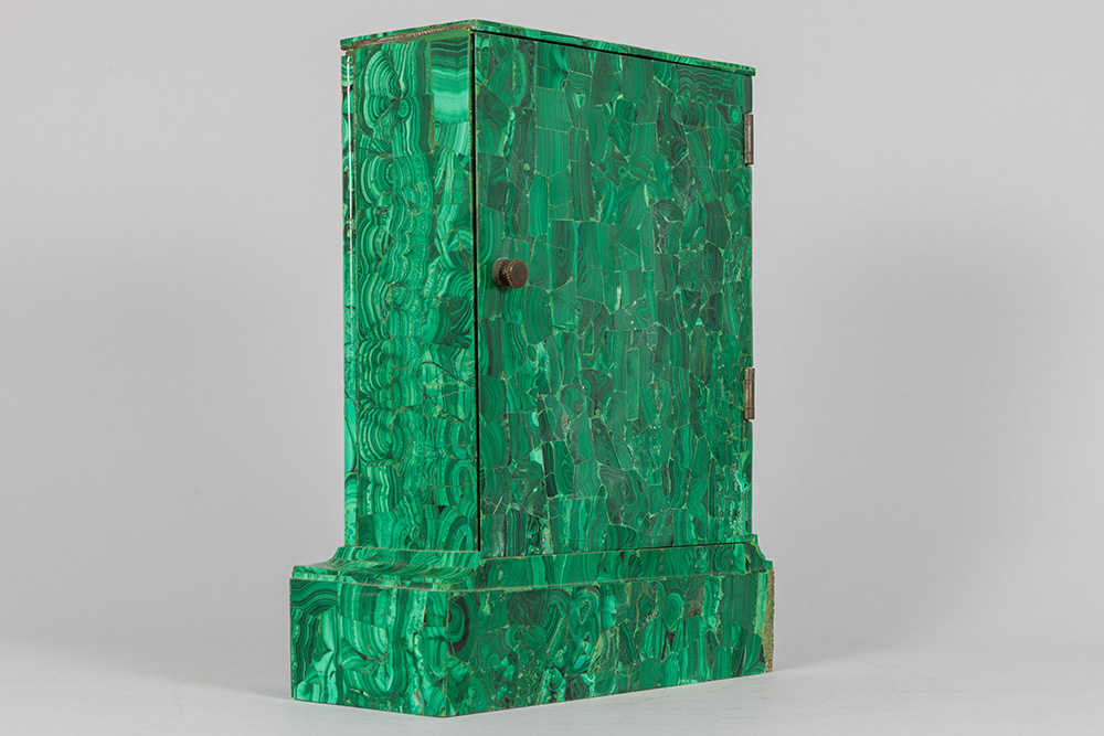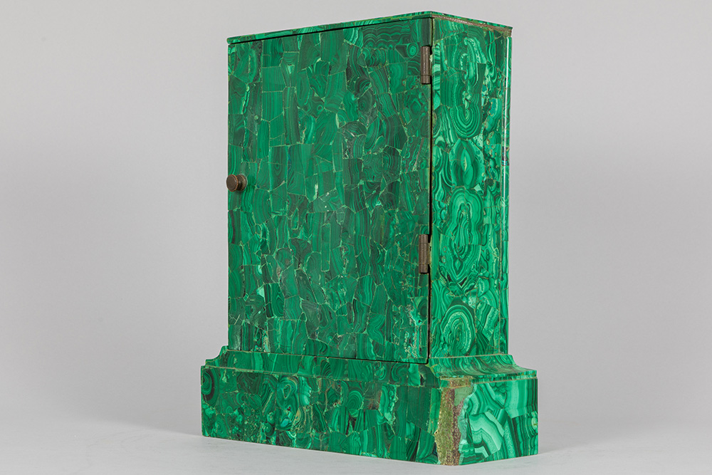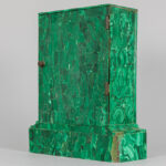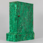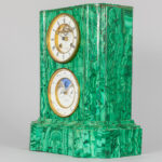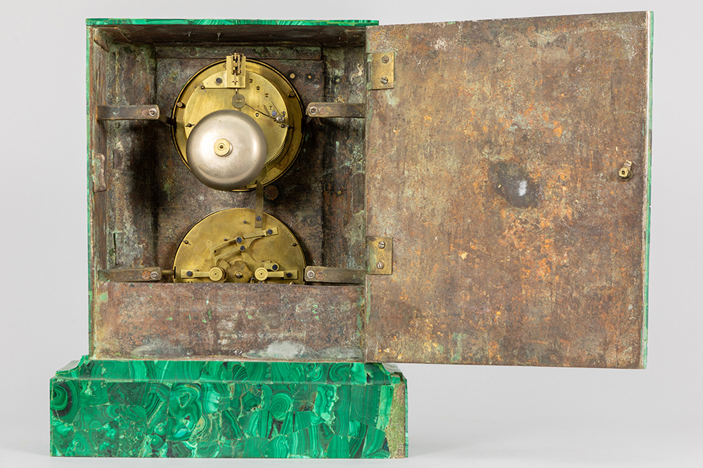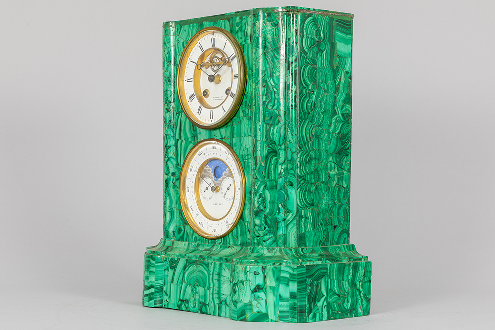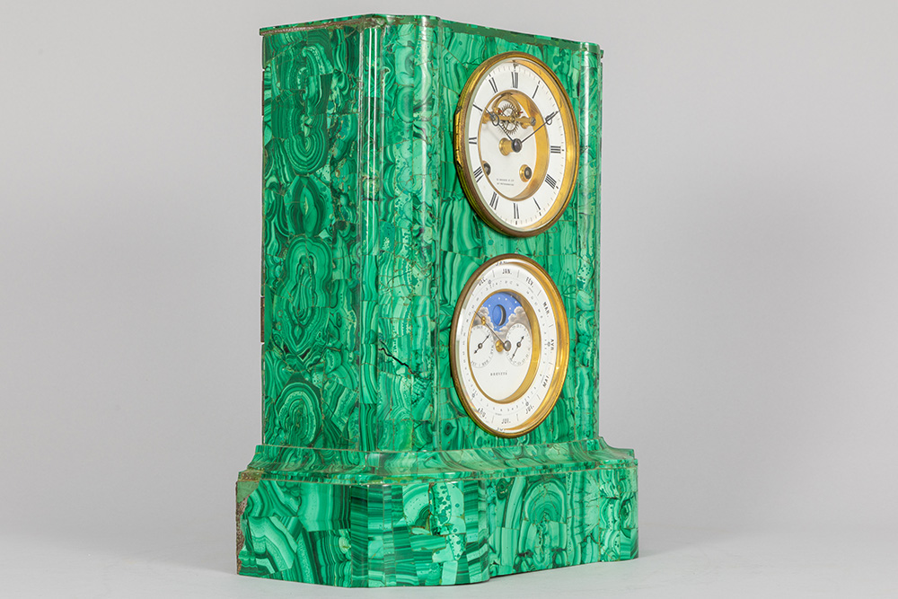 H. MOSER – St PETERSBURG negentiende eeuwse Russische klok met kast bekleed met malachiet en met een werk met dag- en maanstand, kalender – hoogte en breedte : 39 en 31 cm getekend op de wijzerplaat en het werk