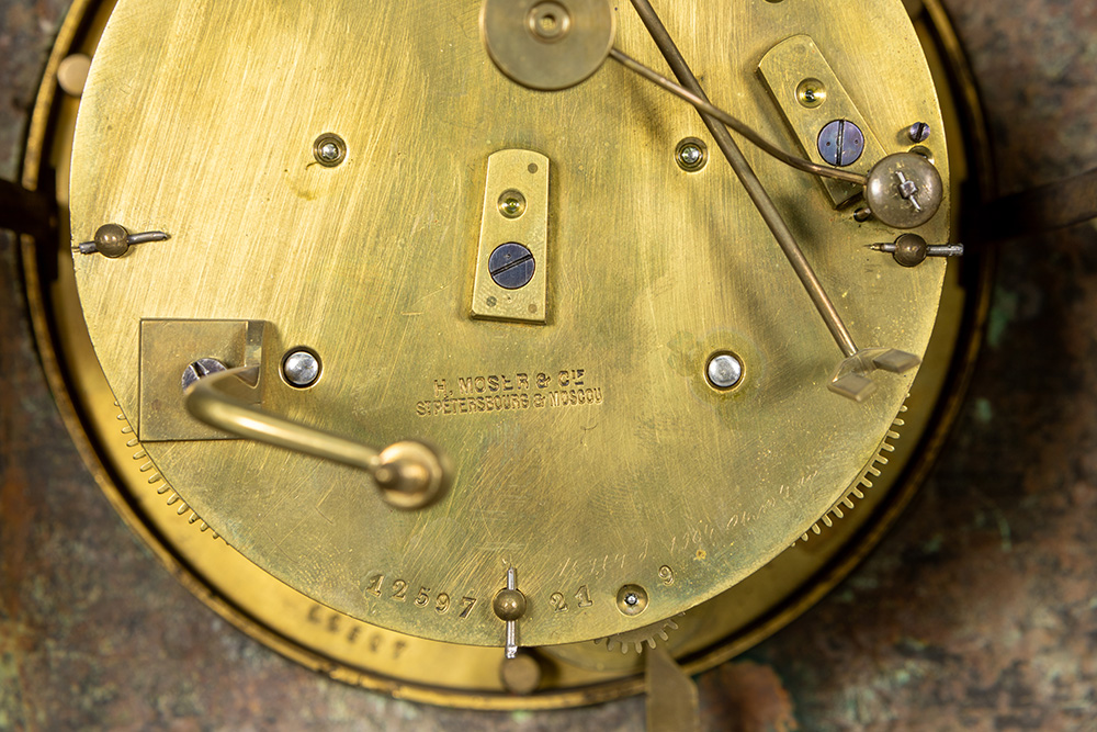 antique Russian “H. Moser St Petersburg” face and work signed clock with its case covered with malachite