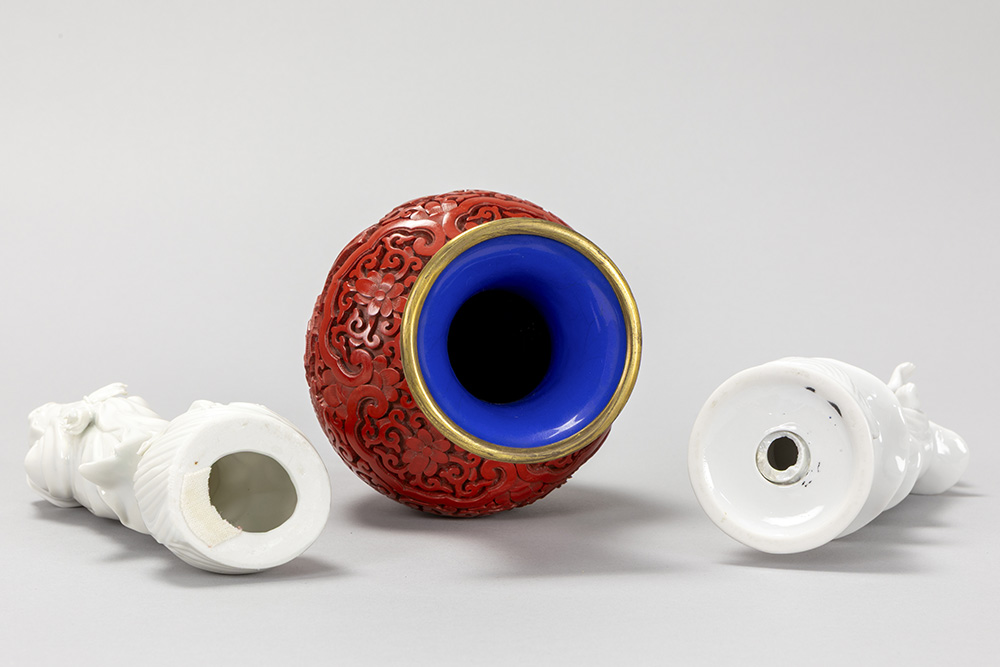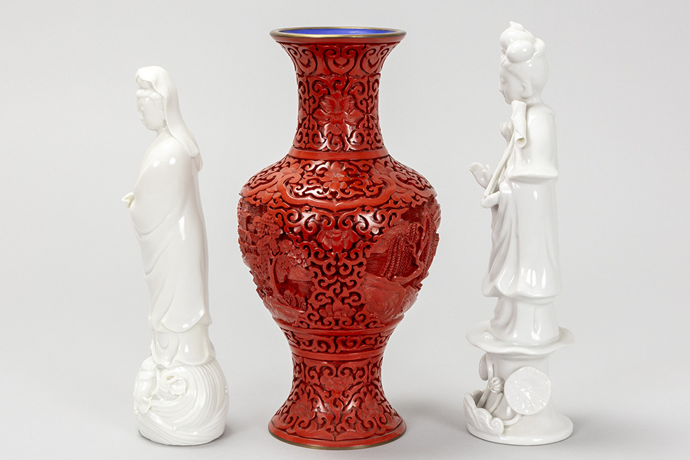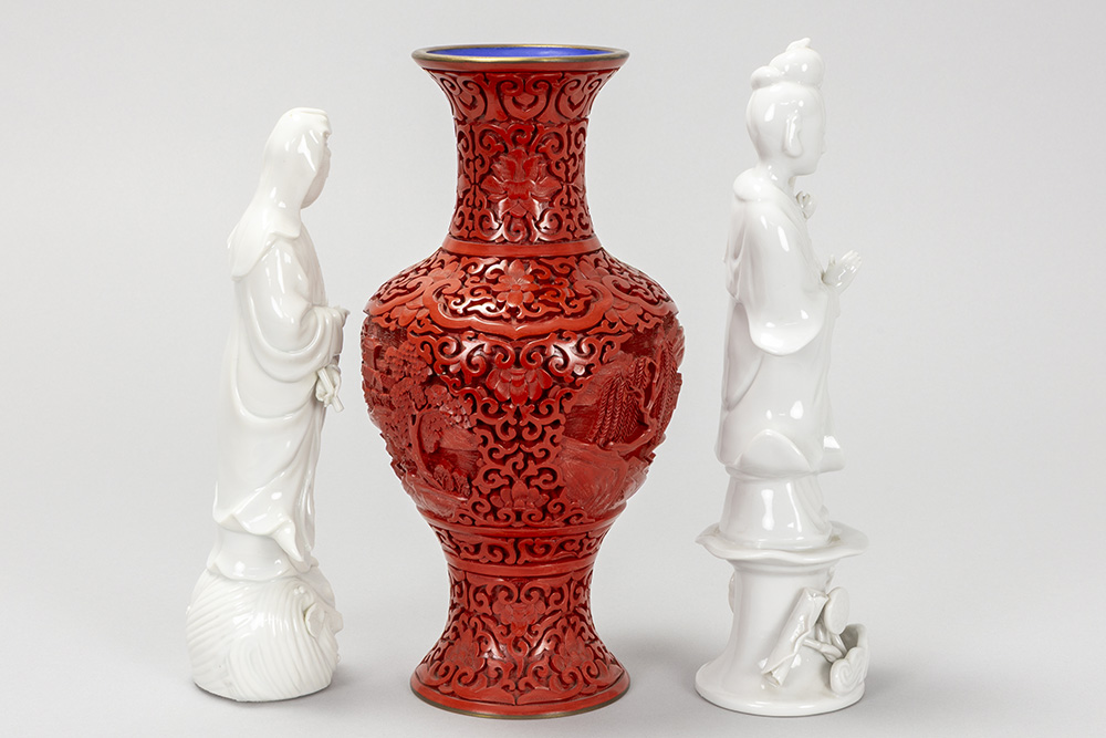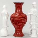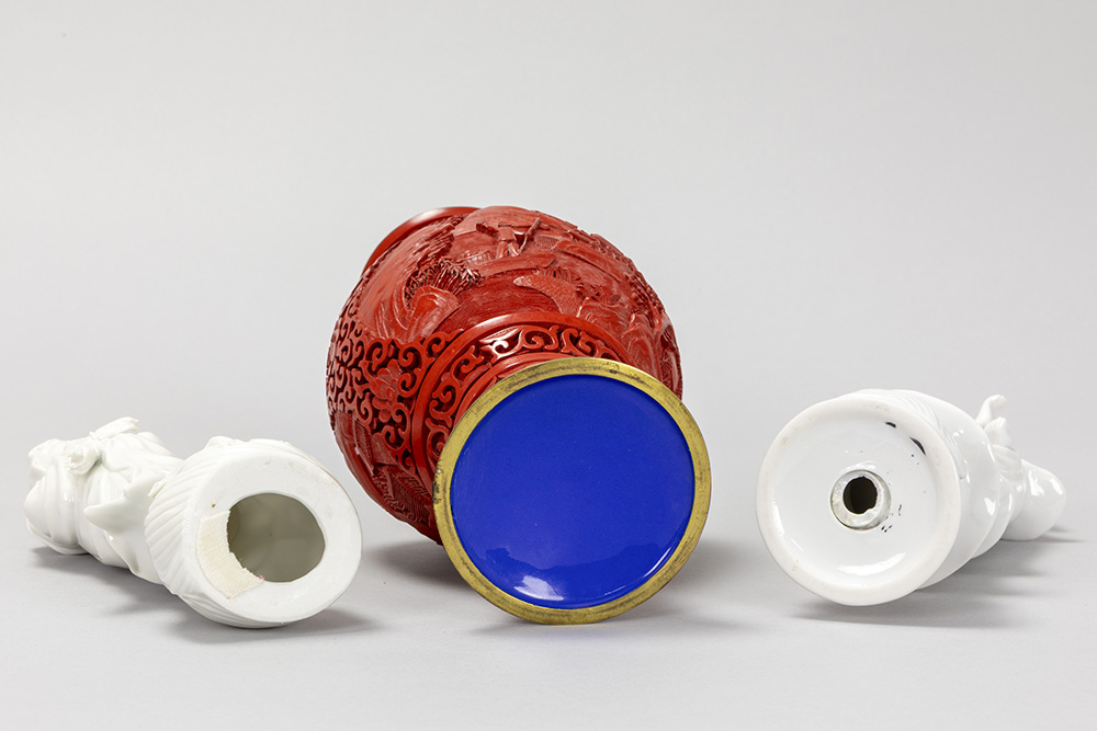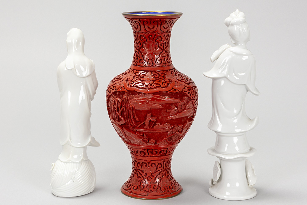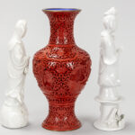 Lot (3) met een Chinese vaas in rood lakwerk en twee beeldjes in “blanc de Chine”- porselein – hoogtes : 26, 23 en 26 cm