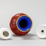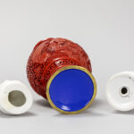 various lot with a Chinese red lacquerware vase and two small sculptures in Chinese porcelain