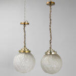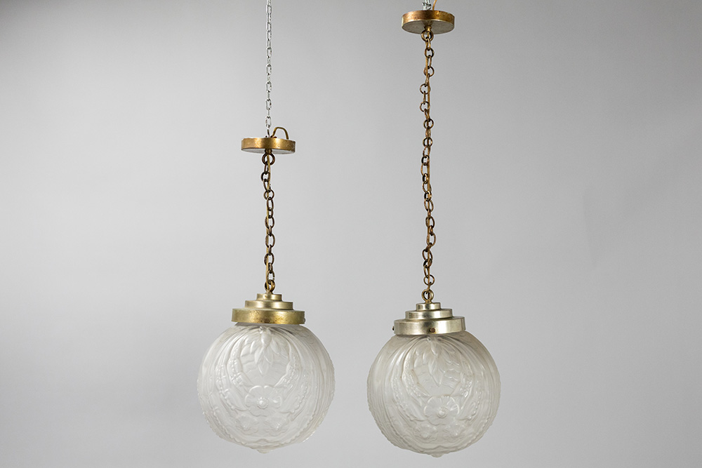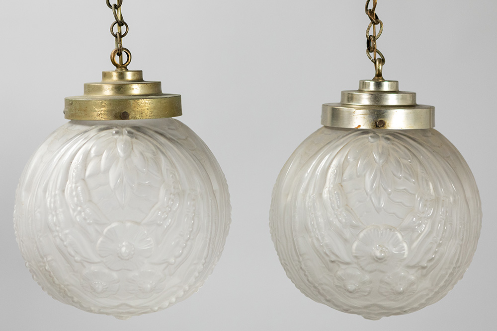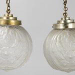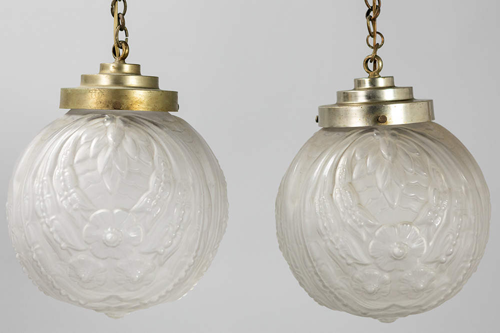 Paar Belgische Art Deco-bollusters met bollen in dik, gesatineerd kristalglas met een floraal decor – diameter : ca 26 cm prov : historisch “Hotel du Louvre” van de Karel Janssenslaan in Oostende, dat nu wordt gerenoveerd