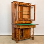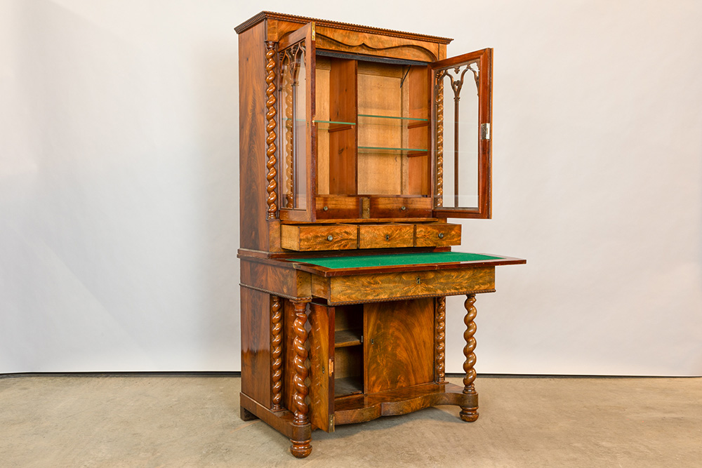 Negentiende eeuwse damessecrétaire uit de Charles X – periode in acajou met lade, twee deuren, twee vitrinedeuren en een openklappend blad – 173 x 93 x 59 cm