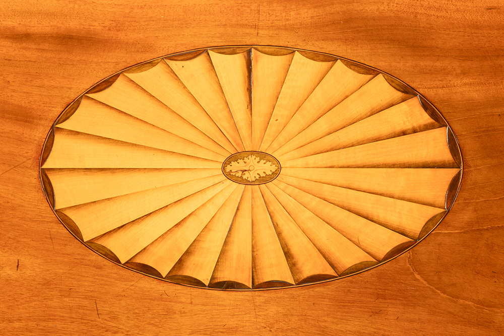 Art Deco-ensemble in acajou, versierd met ingelegde medaillon in Sheraton-stijl : bed, baldakijn, twee nachttafels (70 x 43 x 32 cm) en tweedeurskast (217 x 148 x 58 cm)