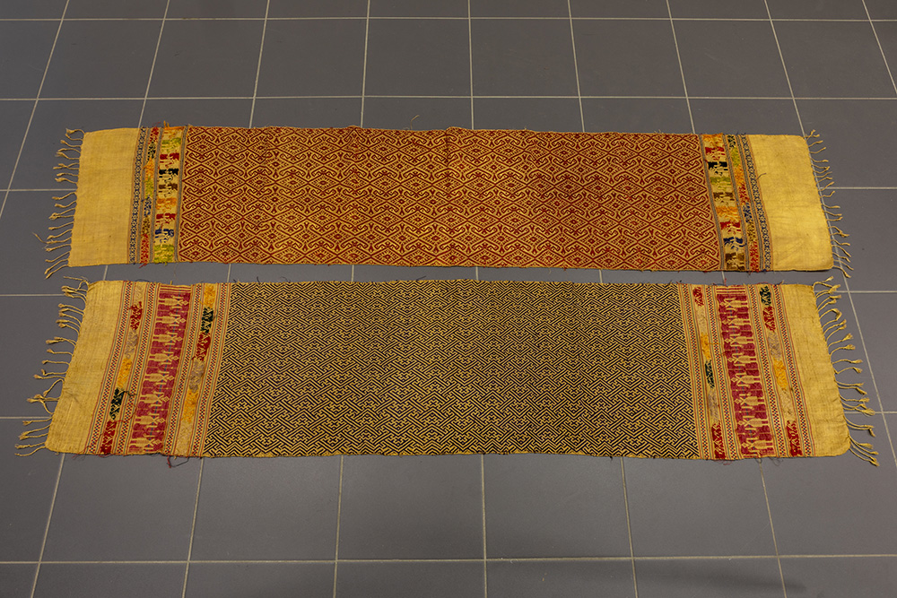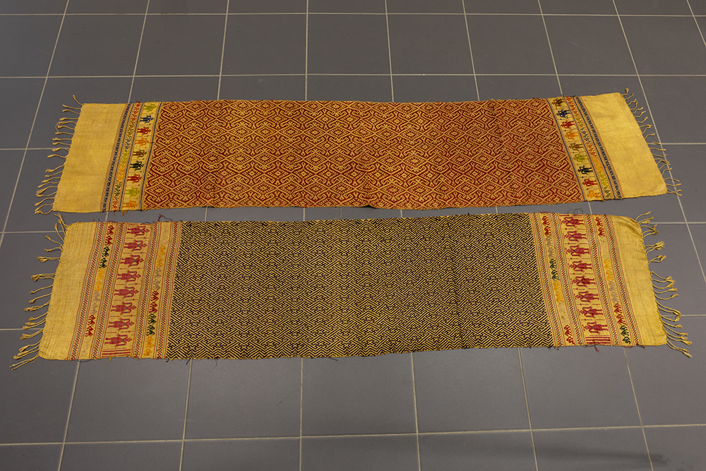 Twee ‘antieke’ handgeweven sjaals uit Laos in zijde op zijde – telkens ca 192 x 41 cm