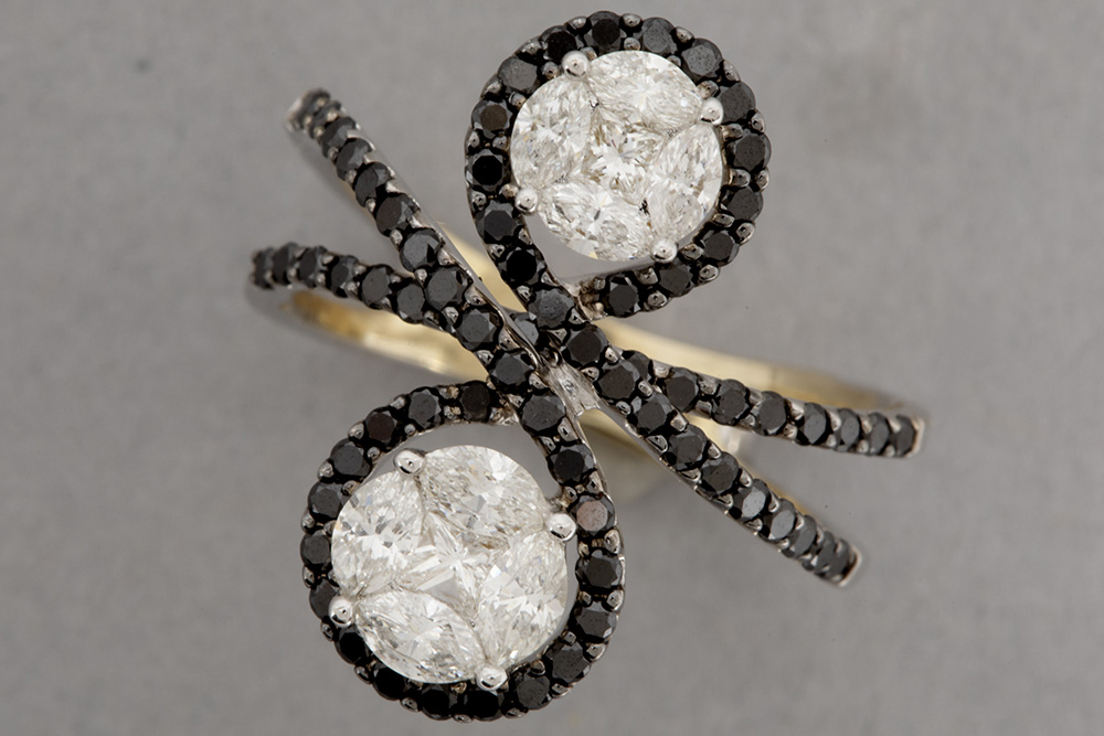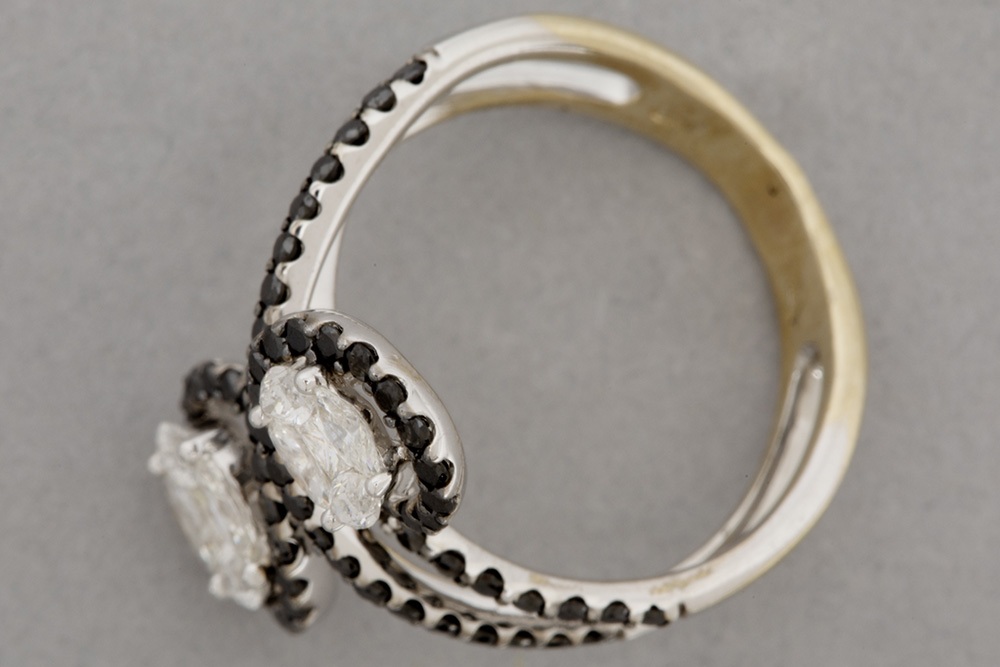 nice ring with an attractive “Toi et Moi” design in white gold (18 carat) with more then half a carat of black high quality brilliant cut diamond and ca 0,50 carat of very high quality white brilliant cut diamonds – size 53