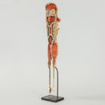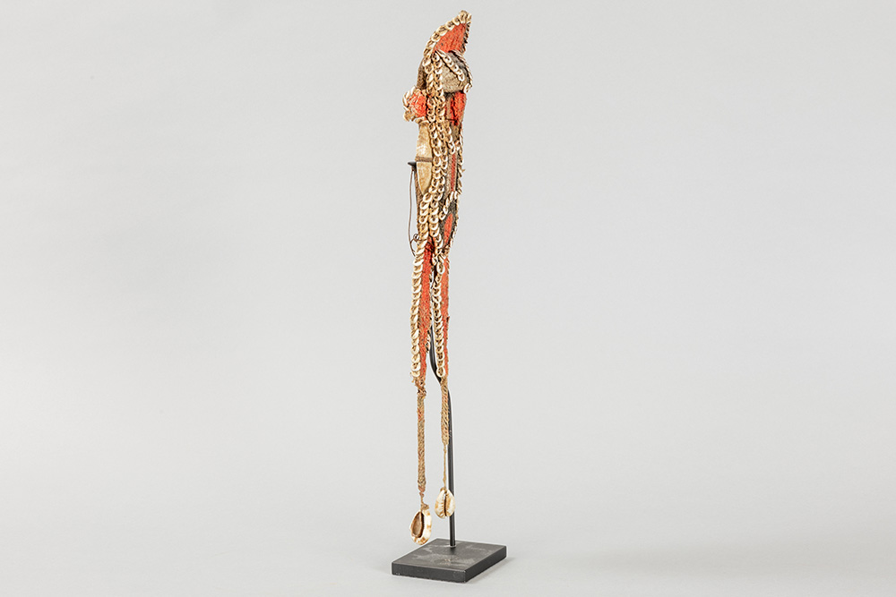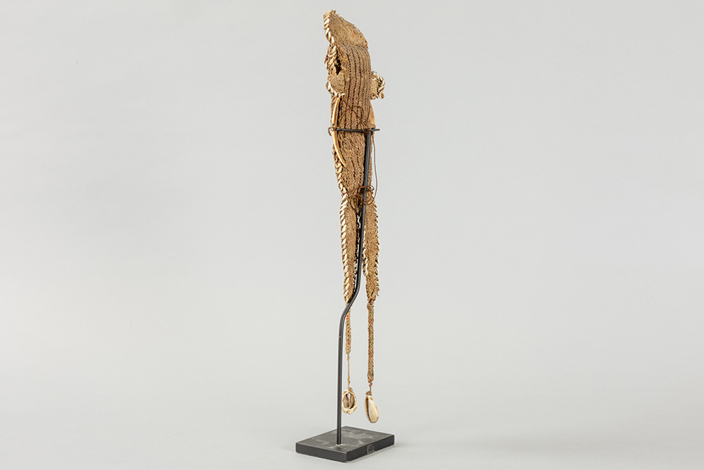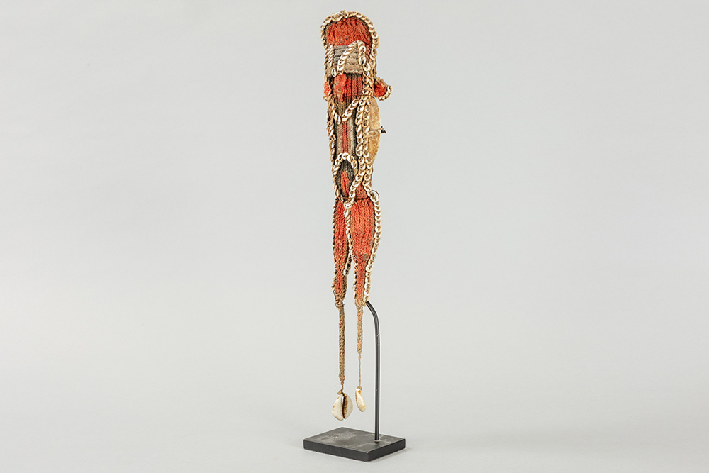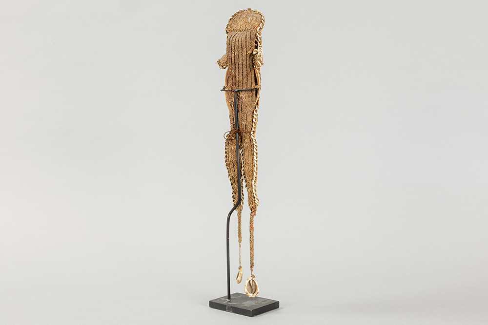 PAPOEASIE NIEUW – GUINEA Sepik-sculptuur in textiel met schelpjes, varkenstanden en pigmenten met een antropomorfe (vrouwelijke) vorm – hoogte : 40 cm – gemonteerd
