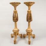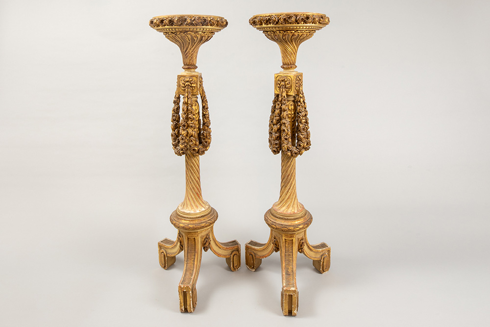nice pair of antique neoclassical pedestals in polychromed wood with finely sculpted festoons of roses