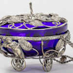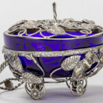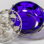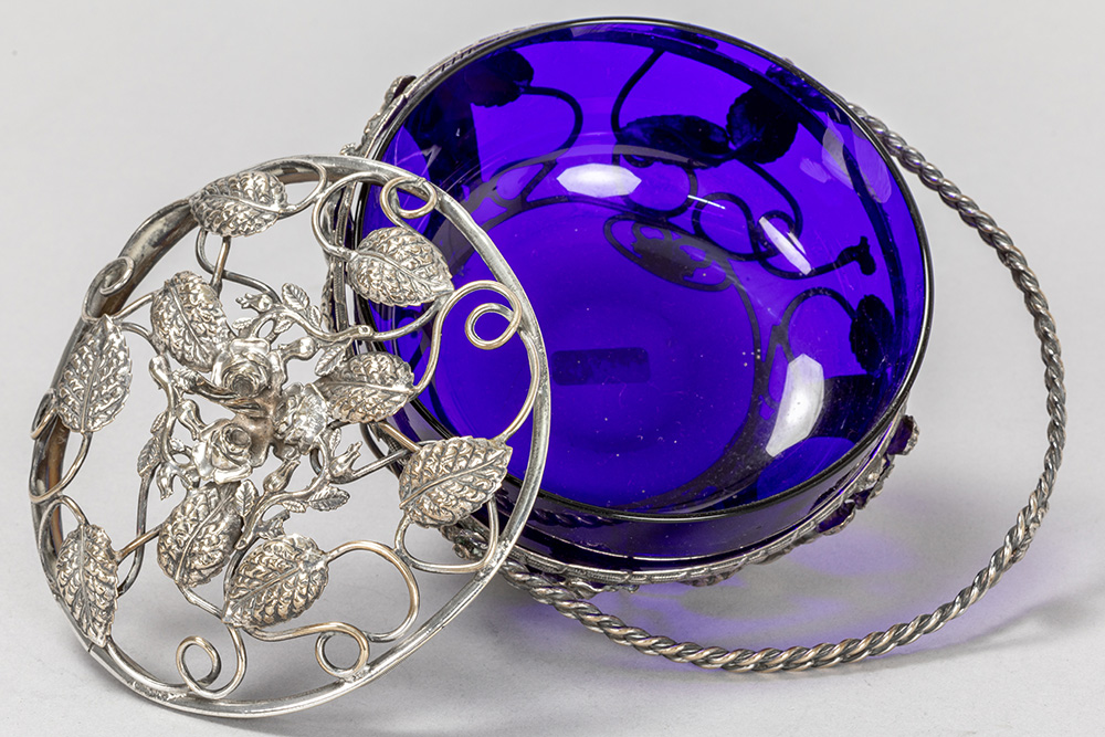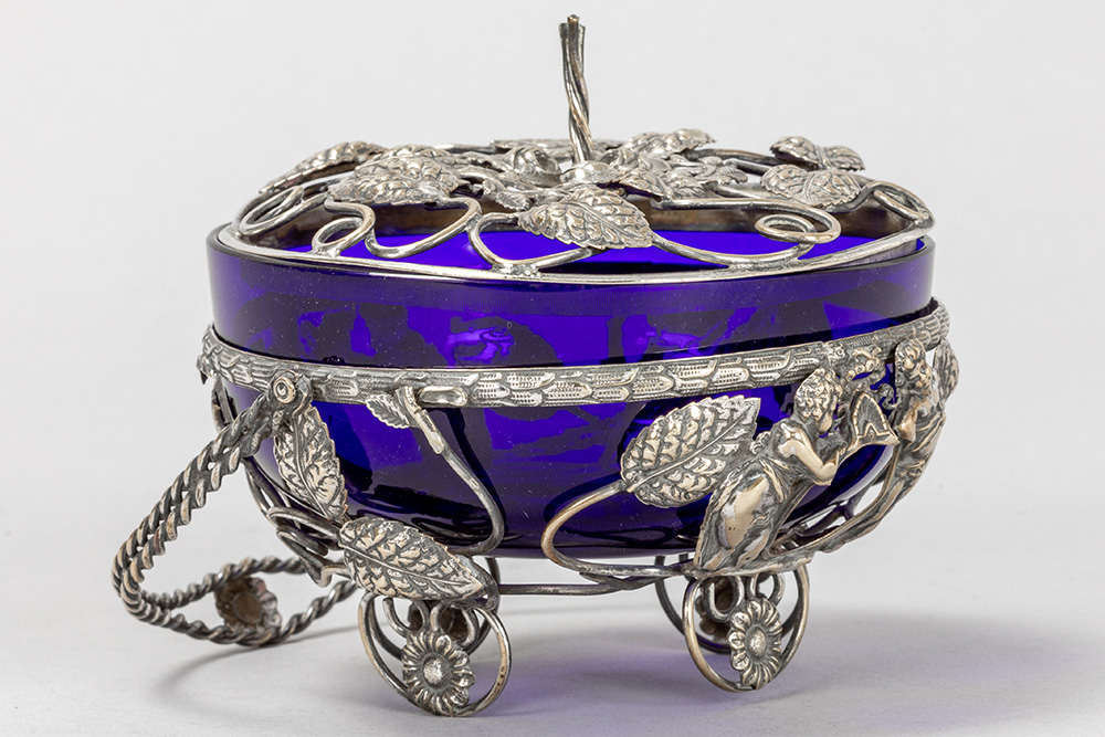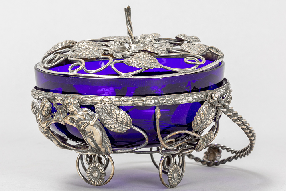 Antieke bonbonnière met liner in blauw kristalglas – diameter : 11,4 cm