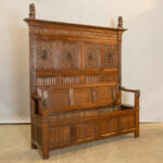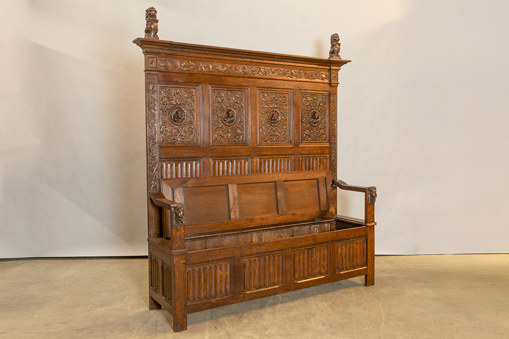 ’antique’ bench with chest in oak with Gothic Revival carvings
