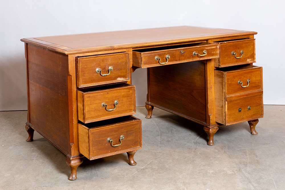 Engelse bureau in acajou met zeven laden en lederen blad – 77,5 x 153 x 91 cm