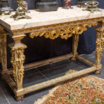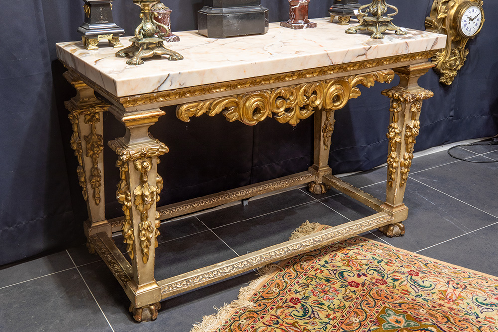 Achttiende eeuwse, allicht Franse Lodewijk XIV-console in rijkgesculpteerd, deels gepolychromeerd en deels met goudblad belegd hout met typische barokke ornamentiek en een typisch dik blad met marmer – 87 x 134 x 64 cm