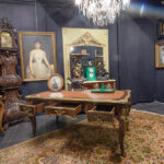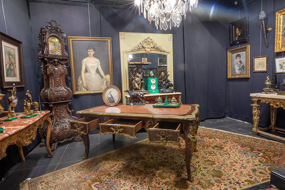 Imposante barokke zgn “bureau plât” in acajou met zeer rijk bronsbeslag ondermeer met vrouwelijke kariatiden – met drie laden aan één zijde – 79 x 178 x 90 cm
