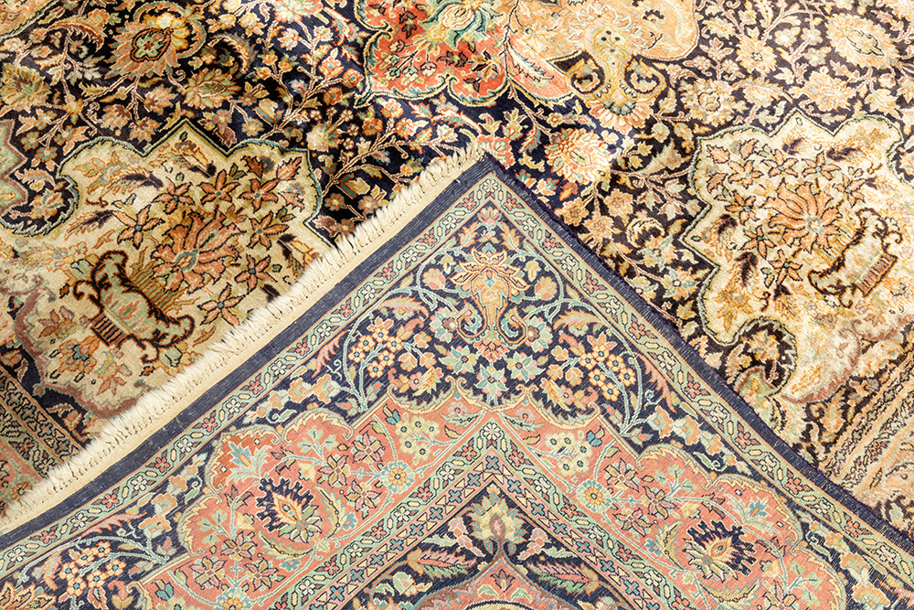 Cachemerean Qom in silk with a medallion design on a blue background