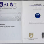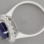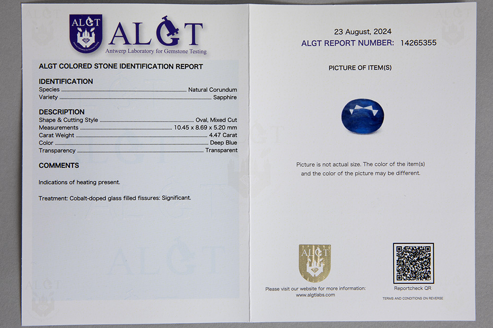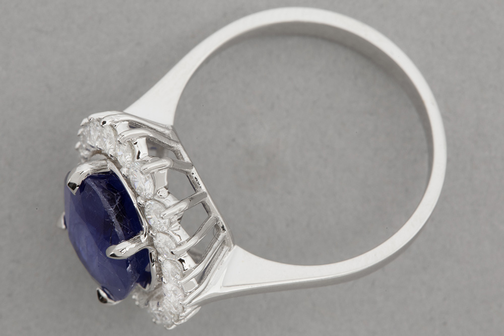 Klassieke entouragering in witgoud (18 karaat) centraal bezet met een ovale saffier van 4,47 karaat, omringd door ca 0,75 karaat witte (F/G) kwaliteitsbriljant met ALGT certificaat