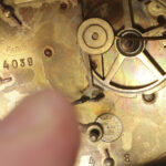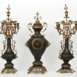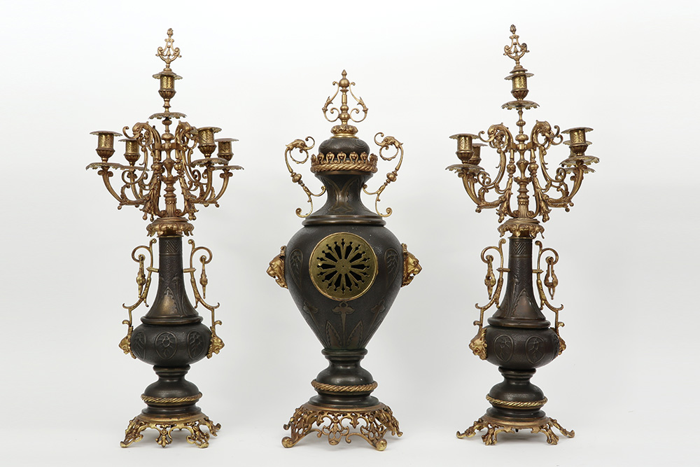 Antieke driedelige schouwgarnituur in deels gedoreerd en deels gepatineerd koper, met een klok met werk getekend H. Luppens – hoogtes : ca 62 cm