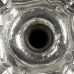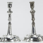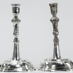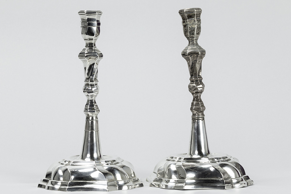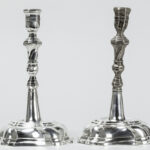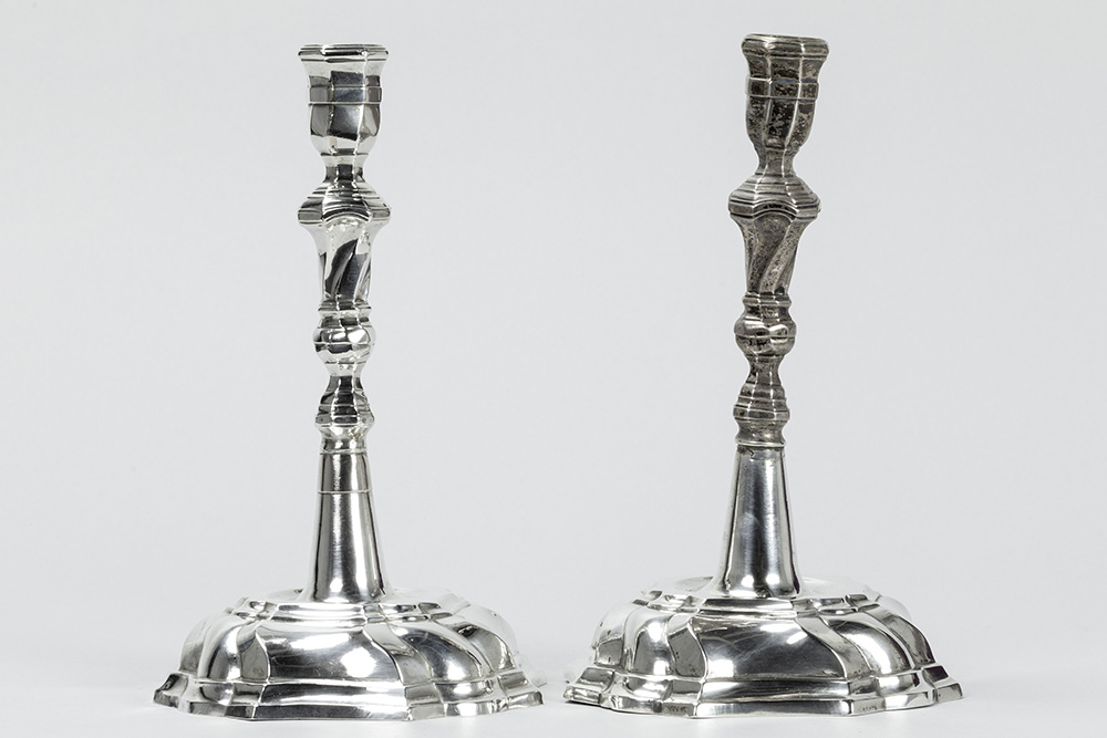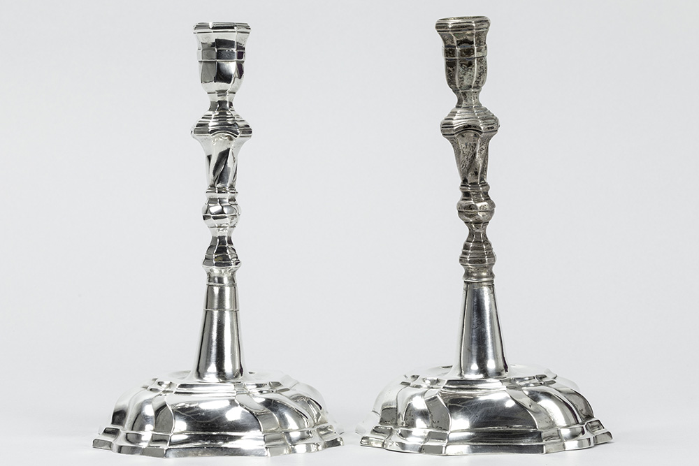 Paar antieke Lodewijk XV kandelaars in massief zilver met verschillende merken, waarvan één met datum ‘1758’, en met typisch model en ornamentiek – hoogte : 21 cm – gewicht : 684 gram