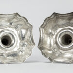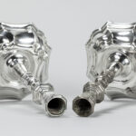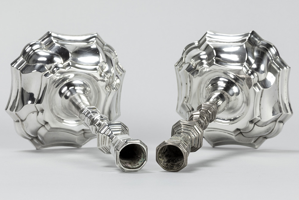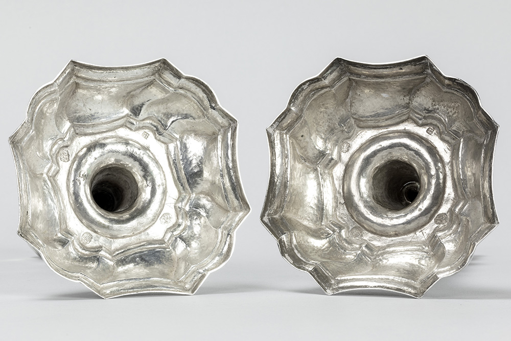 pair of antique Louis XV style candlesticks in silver with several marks of which one has a 1758 date