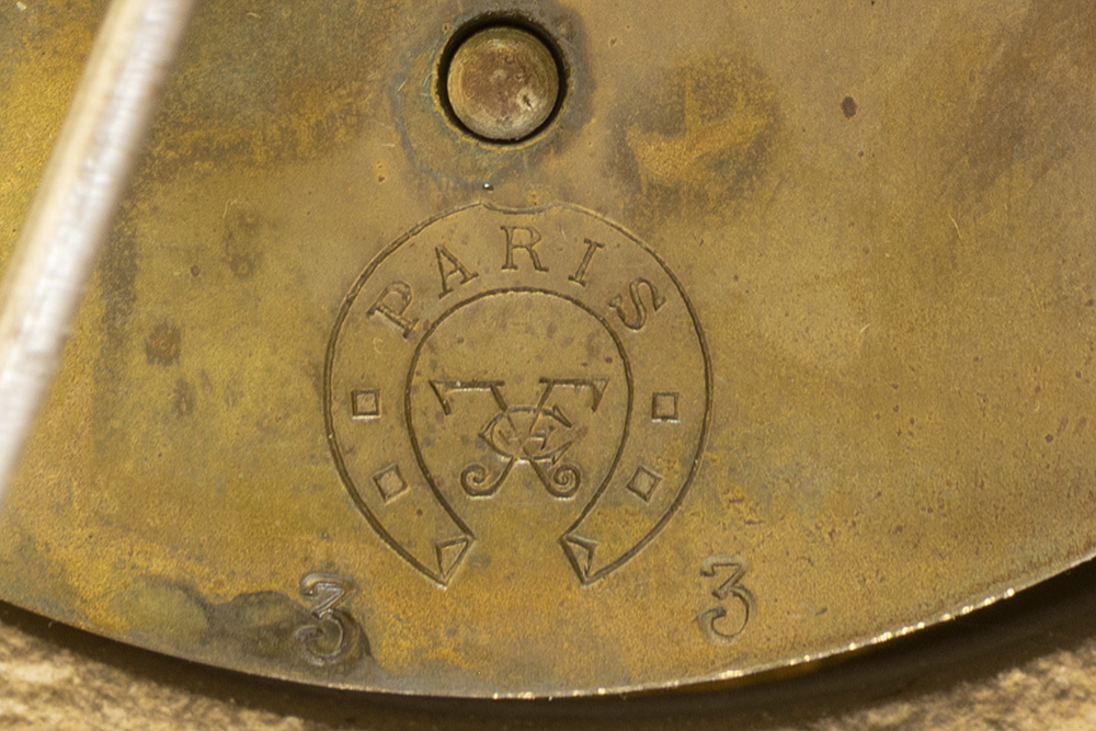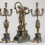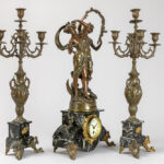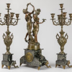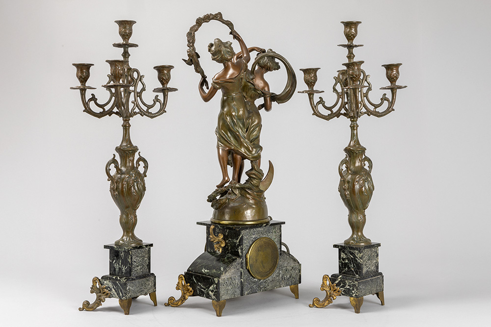 19th Cent. garniture in green marble and metal with a pair of candelabra and a clock with a titled sculpture