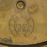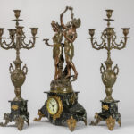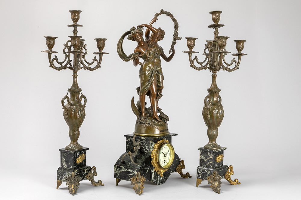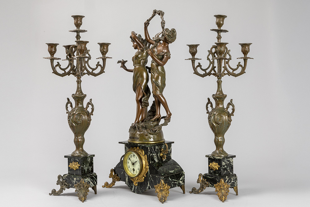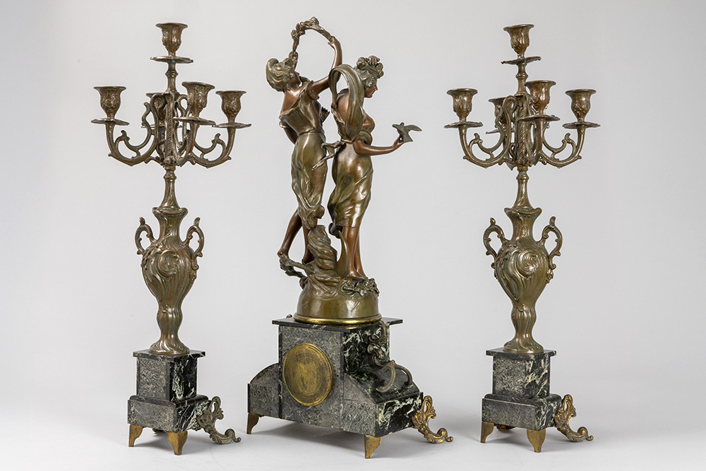 Negentiende eeuwse schouwgarnituur in groene marmer en metaal : paar kandelaars (64 cm hoog) en klok (66 cm hoog) met sculptuur getiteld “Pigeons favoris”