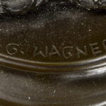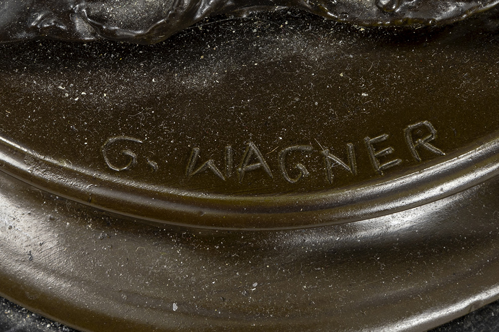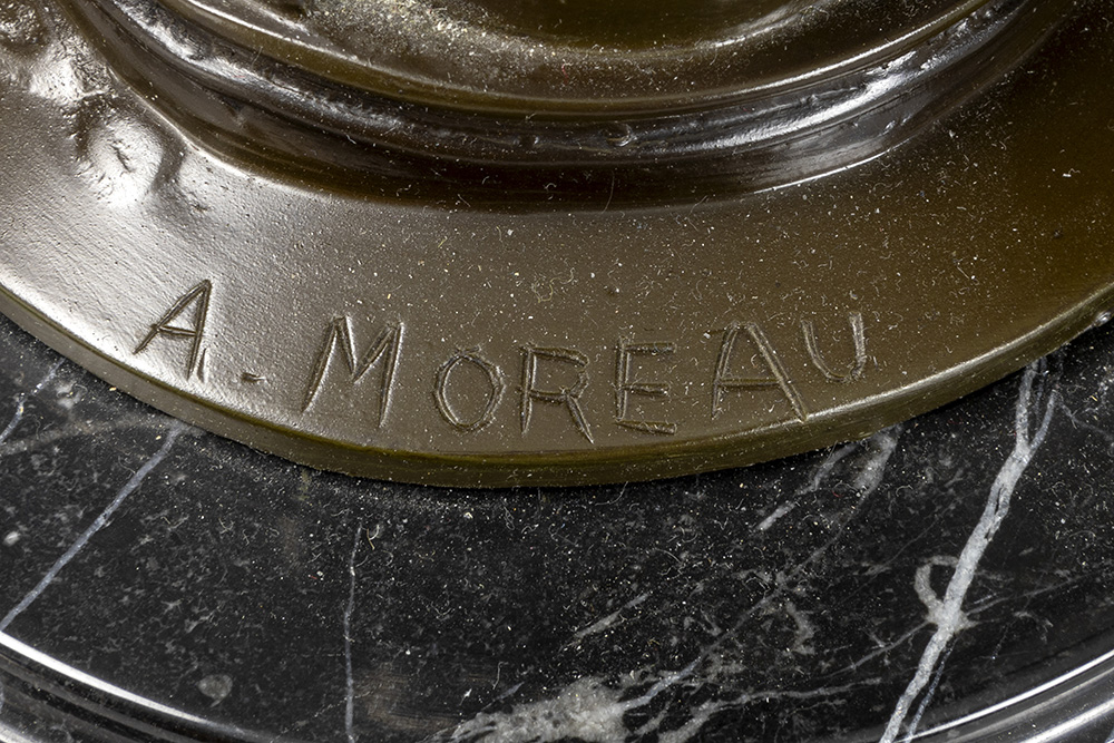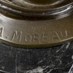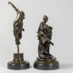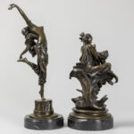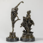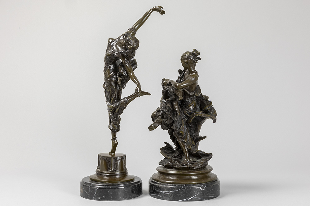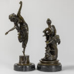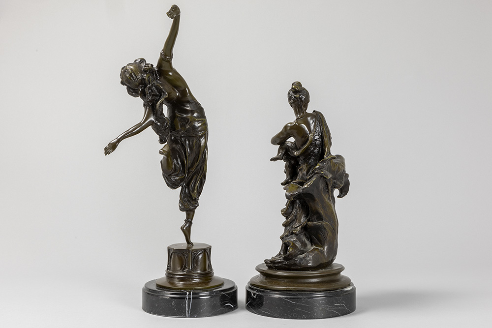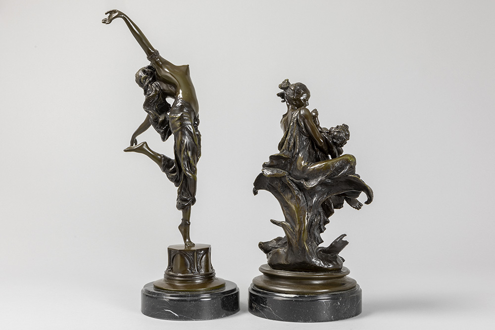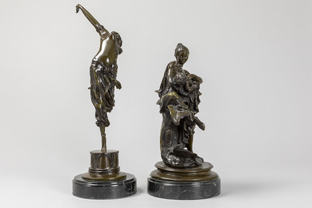 Lot van twee bronzen sculpturen uit de 20° eeuw telkens op marmeren voet : “Danseres” en “Moeder en kind” – hoogtes : 34 en 43,5 cm