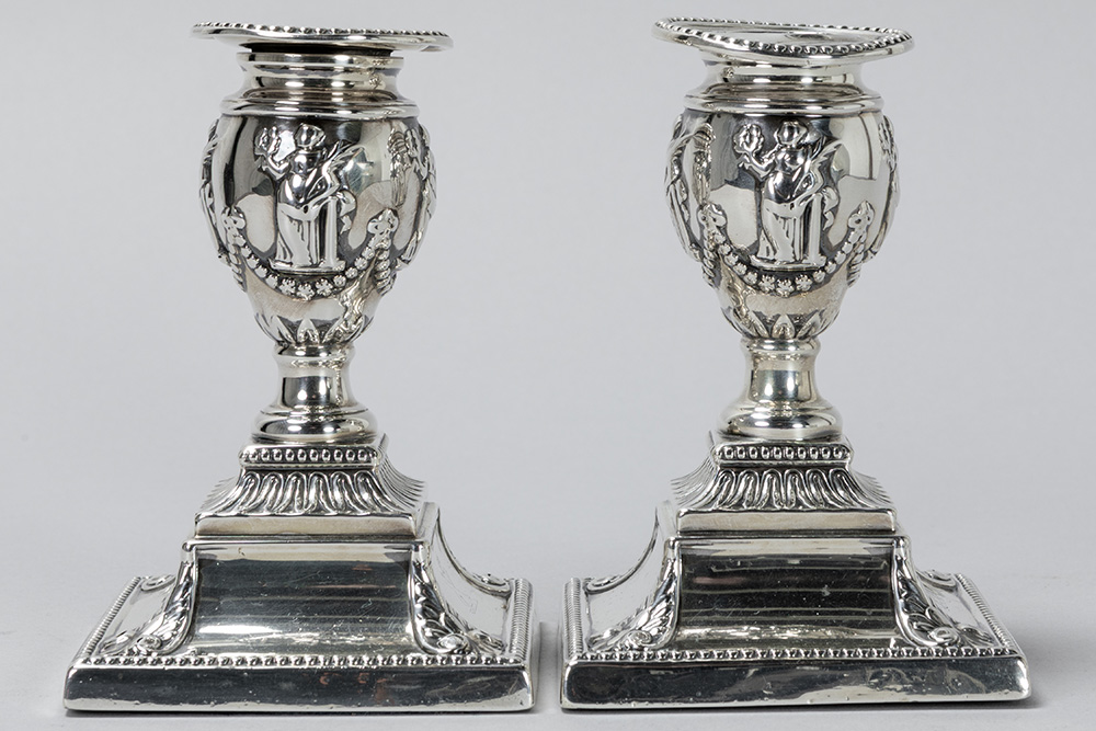 RICHARD HODD & Son paar kleine antieke Engelse kandelaars in massief zilver, gemerkt “925 – Londen 1879” – hoogte : 11,7 cm – gewicht : 628 gram getekend