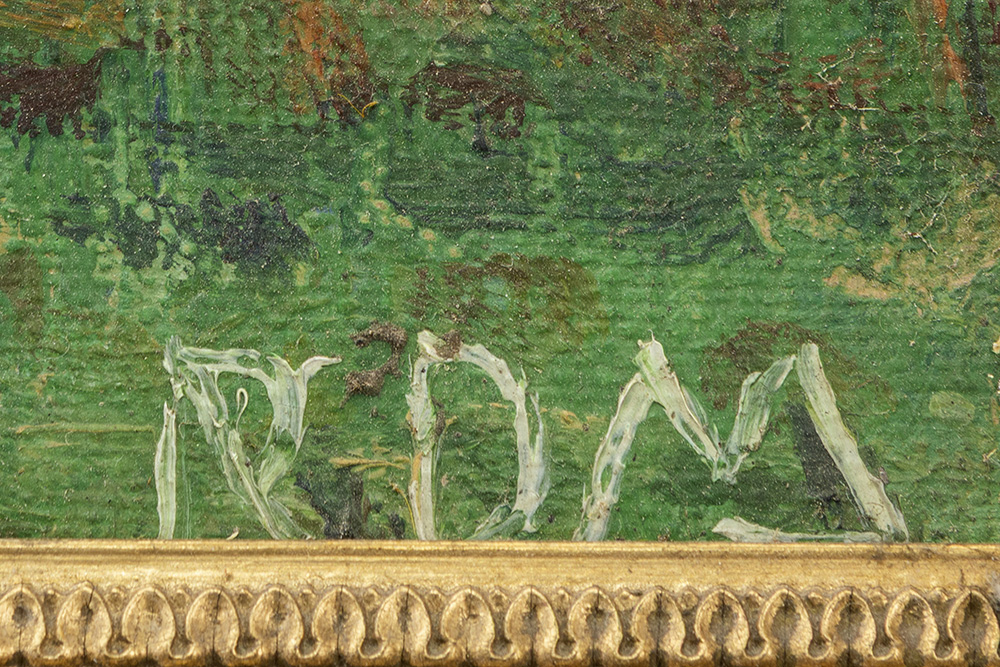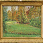 20ste eeuws olieverfschilderij op doek met een tuinzicht, gemonogrammeerd NDM – 36 x 45
