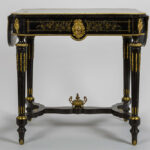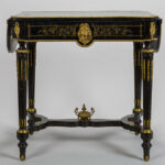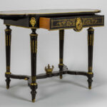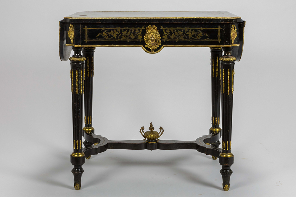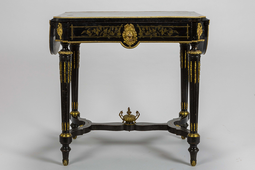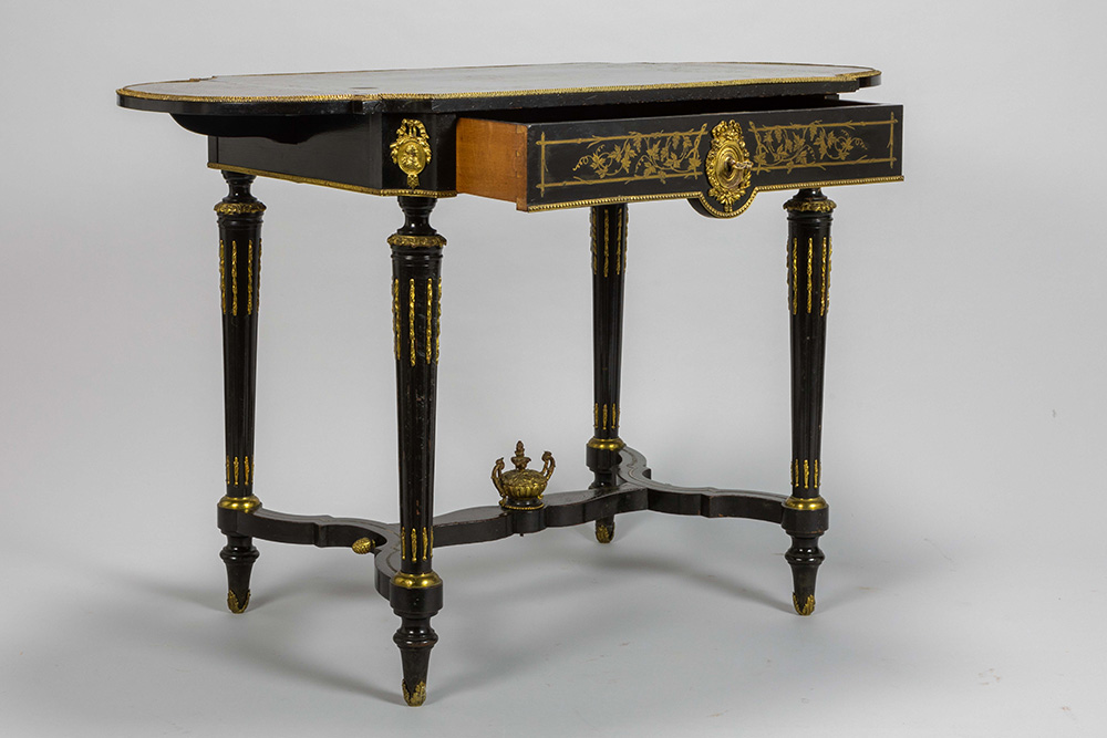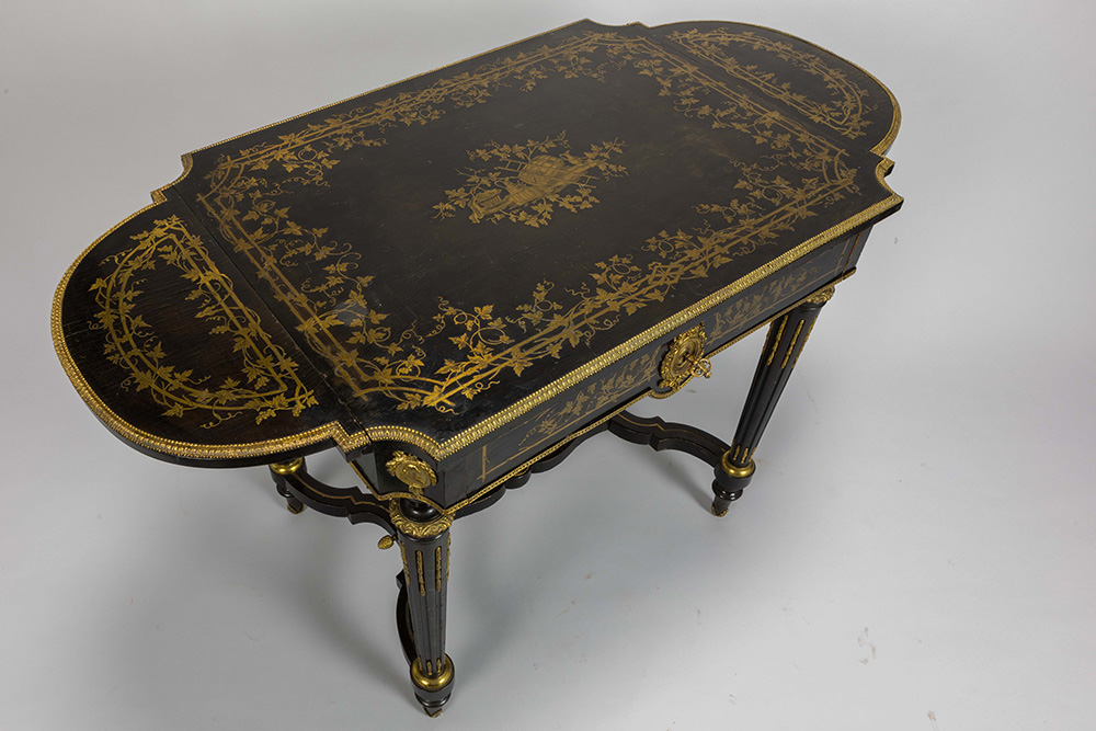 Mooie negentiende eeuwse Franse Napoleon III-bijzettafel met lade en twee klapbladen in ebbenhout en geëboniseerd hout met typisch ingelegd decor in koper en met gedoreerd bronsbeslag – 73 x 73 (+ 19 + 19) x 57 cm