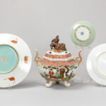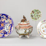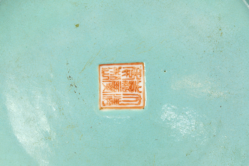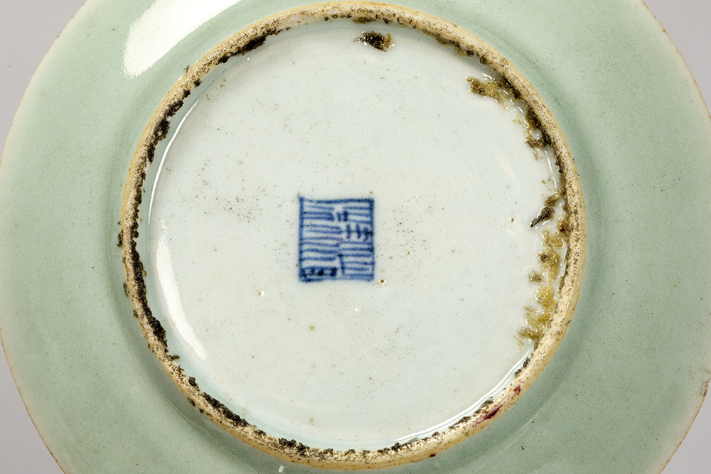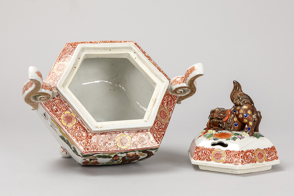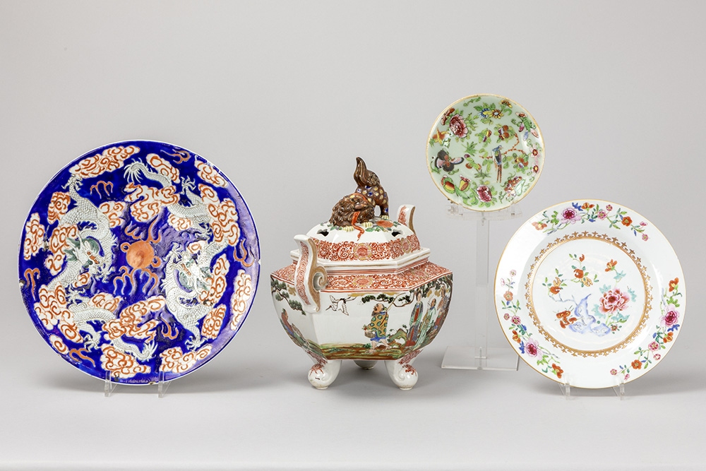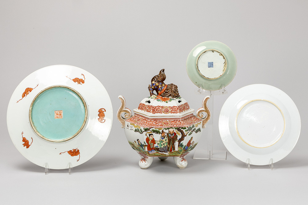 Lot (4) Chinees porselein met een wierookbrander, twee borden en een schaal