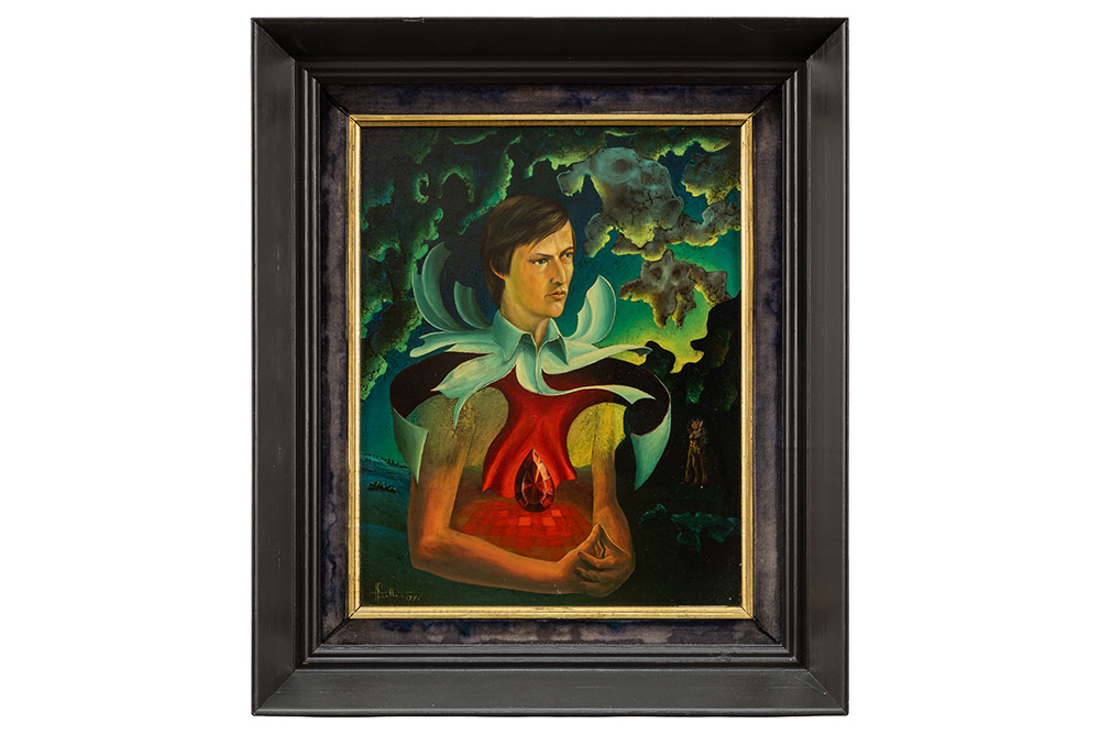 DE PUTTER HUGO (1938 – 1990) olieverfschilderij op paneel met een surrealistisch thema met man – 50 x 40 getekend en gedateerd 1973
