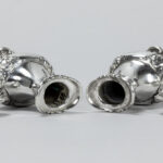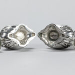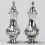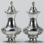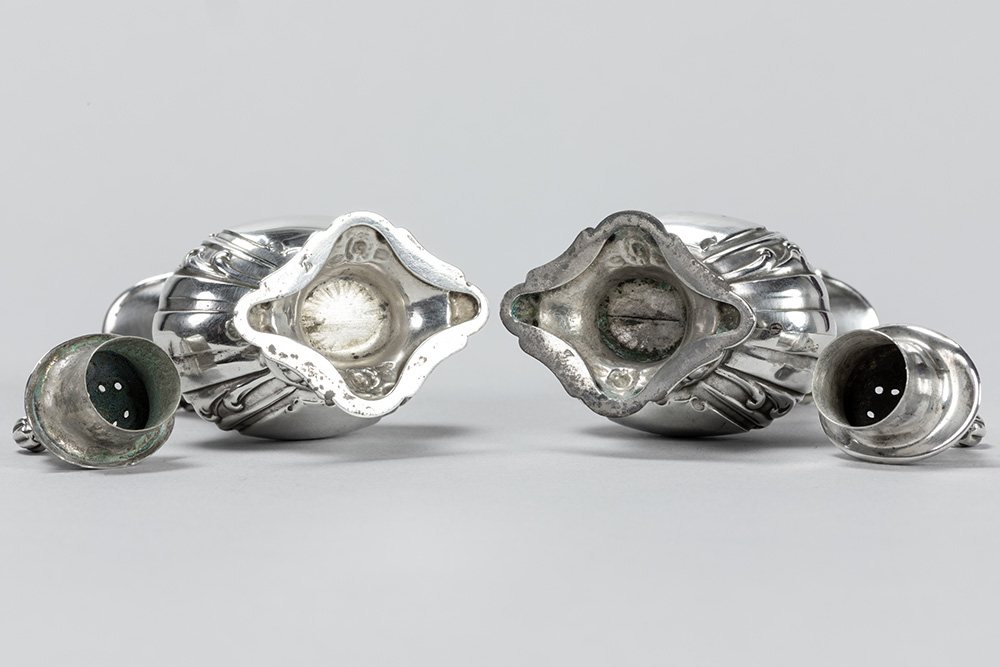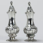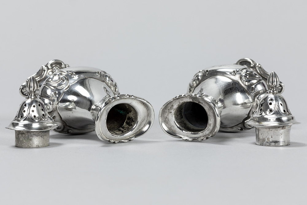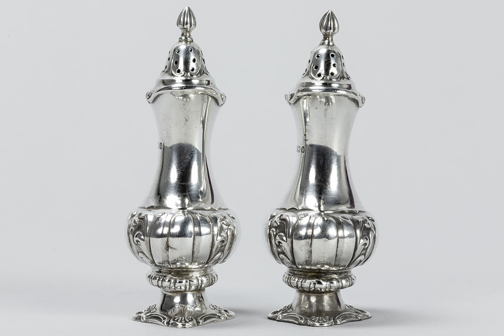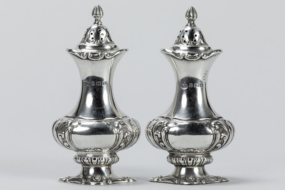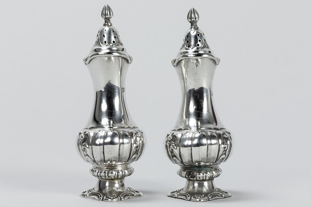 BARKER BROTHERS set van peper- en zoutvat in massief zilver, gemerkt “Birmingham 1901”, met barokke ornamentiek – hoogte : 9,5 cm – gewicht : 76 gram getekend